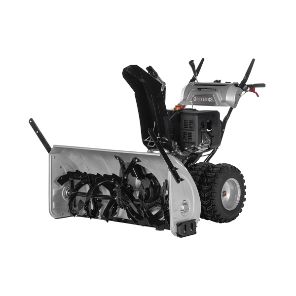 • Die robuste Einzugsschnecke schafft eine Wurfweite bis zu 15 Meter und der Auswurf ist 180° stufenlos drehbar über Handkurbel einstellbar.