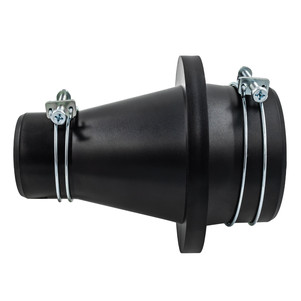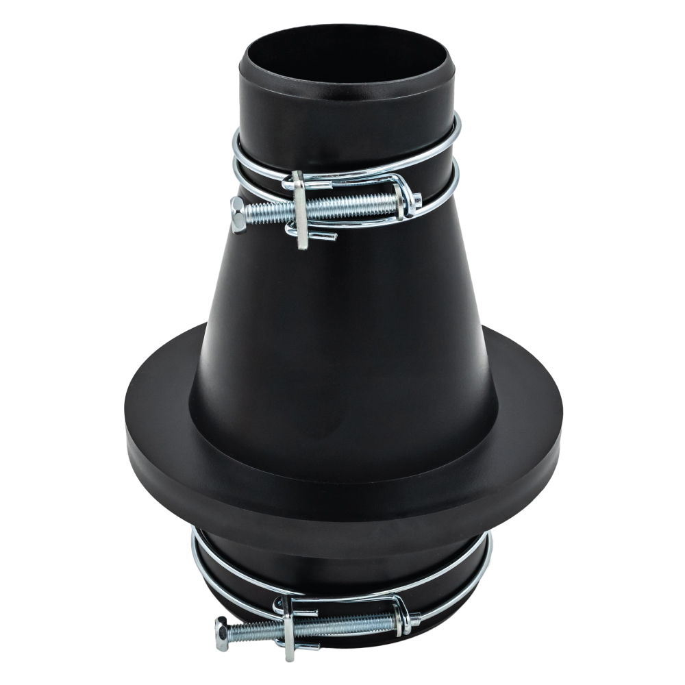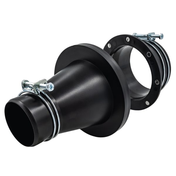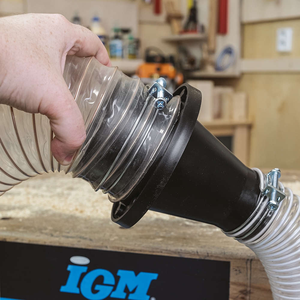 IGM Magnetischer Absauganschluss als Reduzierstück für Schläuche mit einem Durchmesser von 63 mm und 100 mm dient zum schnellen Anschließen und Trennen des Schlauchs zwischen Maschine und Absaugung. Der Stecker besteht aus zwei Teilen. Das 100-mm-Reduzierteil ist mit 8 Magneten ausgestattet, die es fest mit dem 63-mm-Reduzierteil mit Magnetring verbinden. Zur dauerhaften Befestigung am Schlauch sind zwei Drahtklemmen (63 mm und 100 mm) im Lieferumfang enthalten.