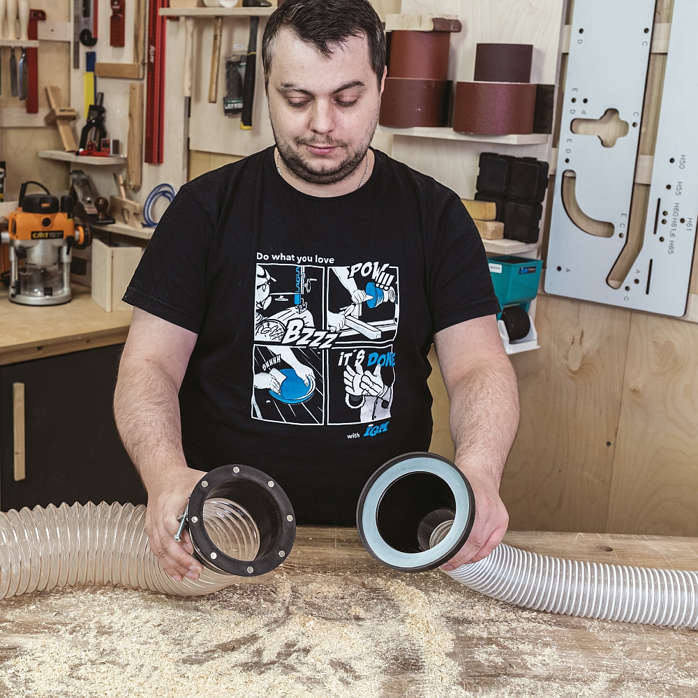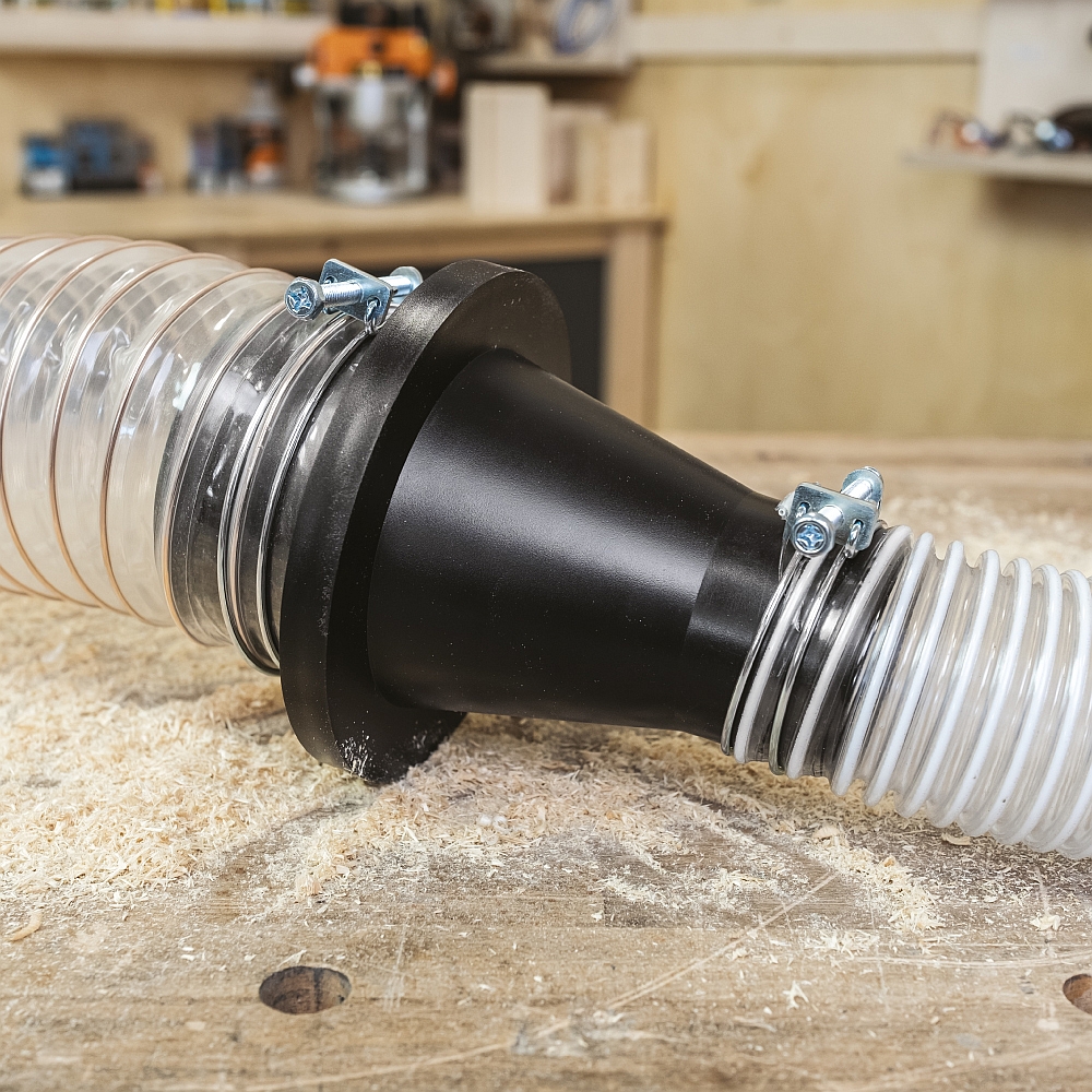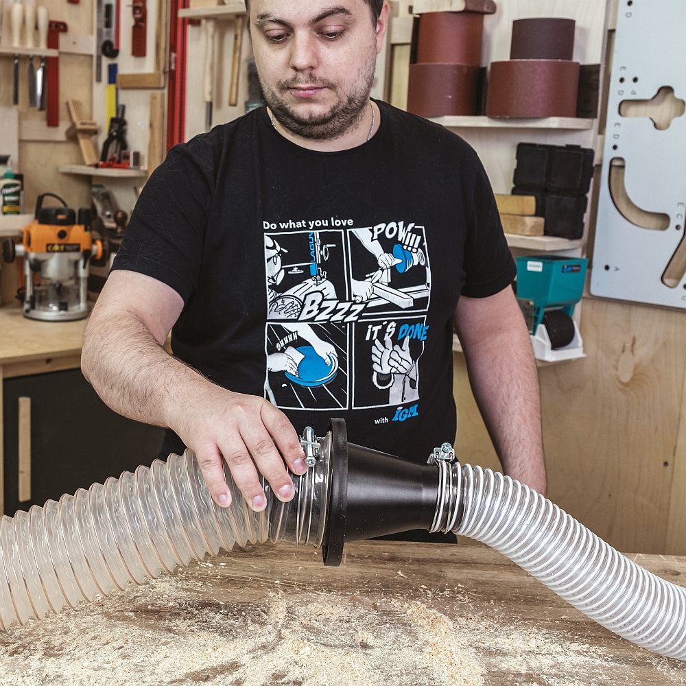 IGM Magnetischer Absauganschluss als Reduzierstück für Schläuche mit einem Durchmesser von 63 mm und 100 mm dient zum schnellen Anschließen und Trennen des Schlauchs zwischen Maschine und Absaugung. Der Stecker besteht aus zwei Teilen. Das 100-mm-Reduzierteil ist mit 8 Magneten ausgestattet, die es fest mit dem 63-mm-Reduzierteil mit Magnetring verbinden. Zur dauerhaften Befestigung am Schlauch sind zwei Drahtklemmen (63 mm und 100 mm) im Lieferumfang enthalten.