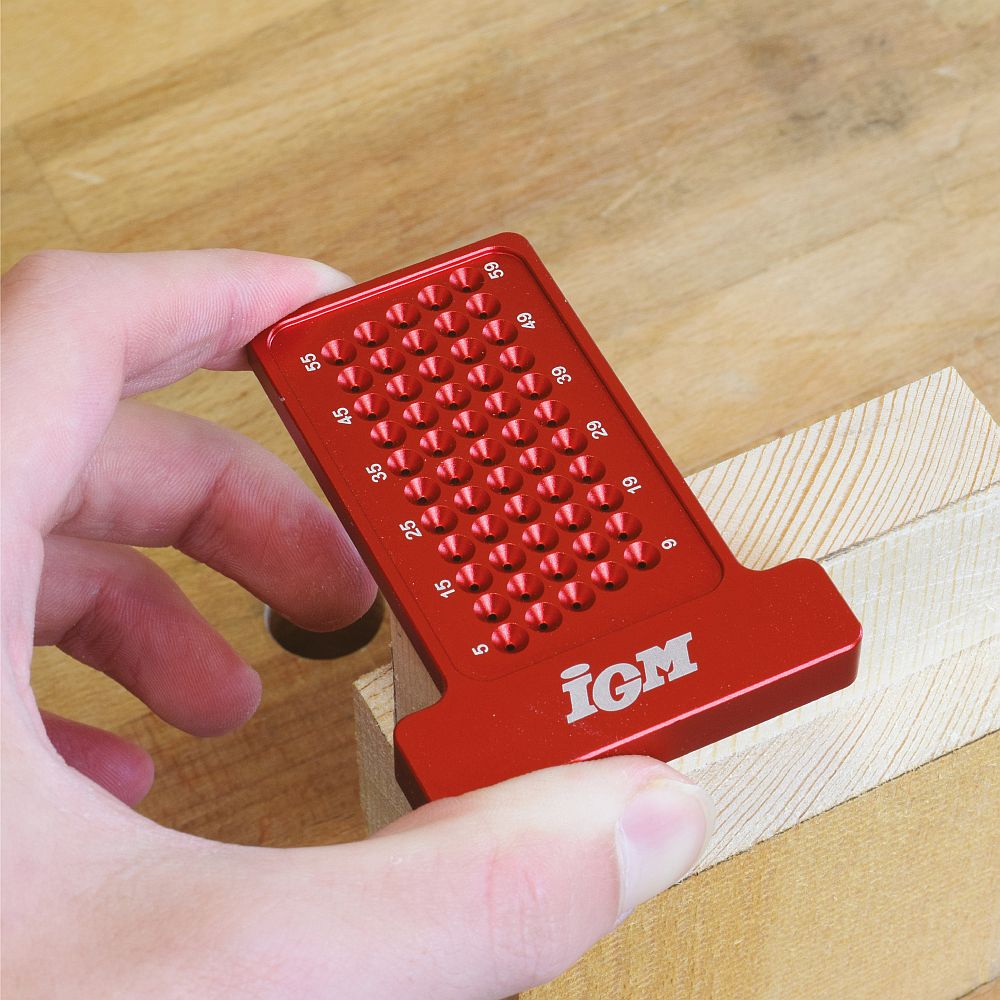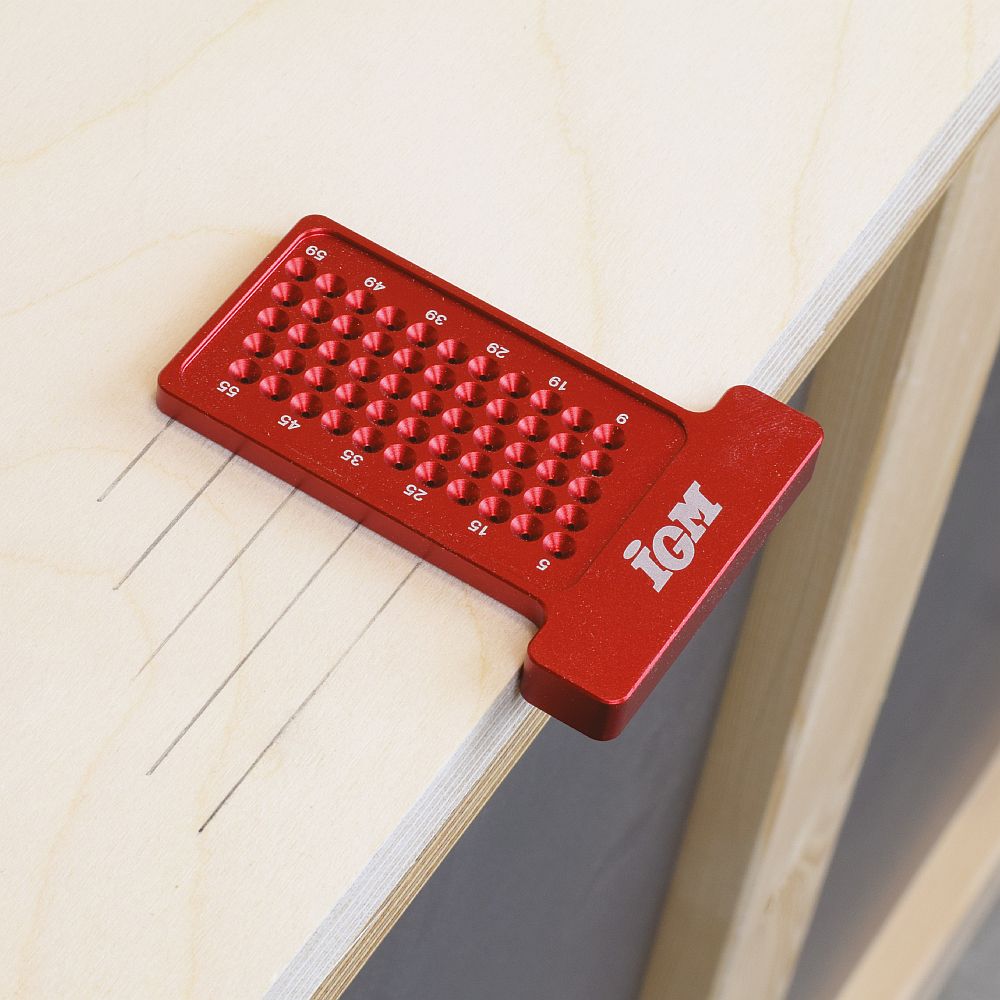 Kleine kompakte Markierungslehre zum Zeichnen von perfekt parallelen Linien entlang der Materialkante. Führen Sie den Bleistift in das entsprechende Loch ein und zeichnen Sie eine parallele Linie, indem Sie das die Markierungslehre entlang der Kante des Werkstückes schieben. Sie können eine parallele Linie im Abstand von 5 bis 60 mm von der Kante des Werkstücks ziehen. Jedes Loch entspricht 1 mm.