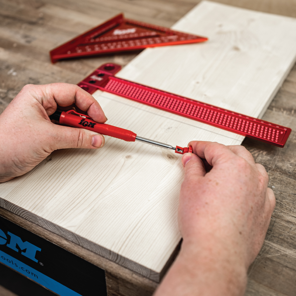 Der vielseitige Minenbleistift für Handwerker verfügt über spezielle auswechselbare Stifte mit einem Durchmesser von 2,8 mm, die Markierungen auf nahezu allen Oberflächen ermöglichen, egal ob trocken, nass, rau, glatt oder staubig.