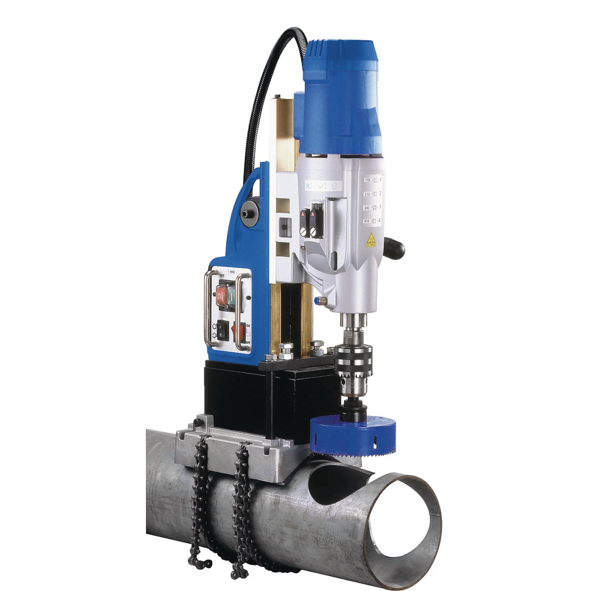 Die Stürmer Maschinen GmbH bietet eine spezielle, stabil und zuverlässige Befestigung für die Metallkraft Magnetbohrmaschine MB 754 an, die sich leicht an Rohren mit Durchmessern zwischen 32 und 203 mm montieren lässt.