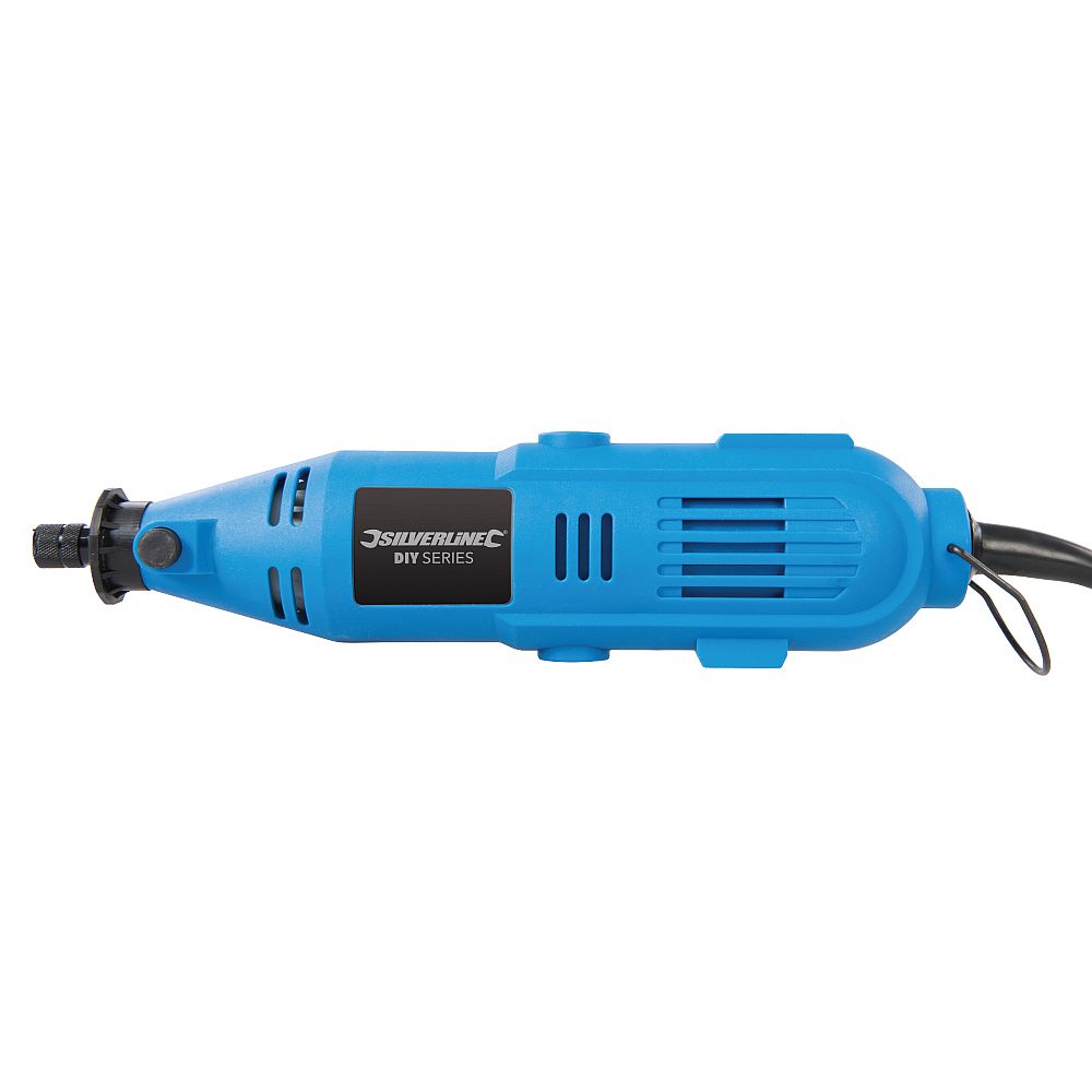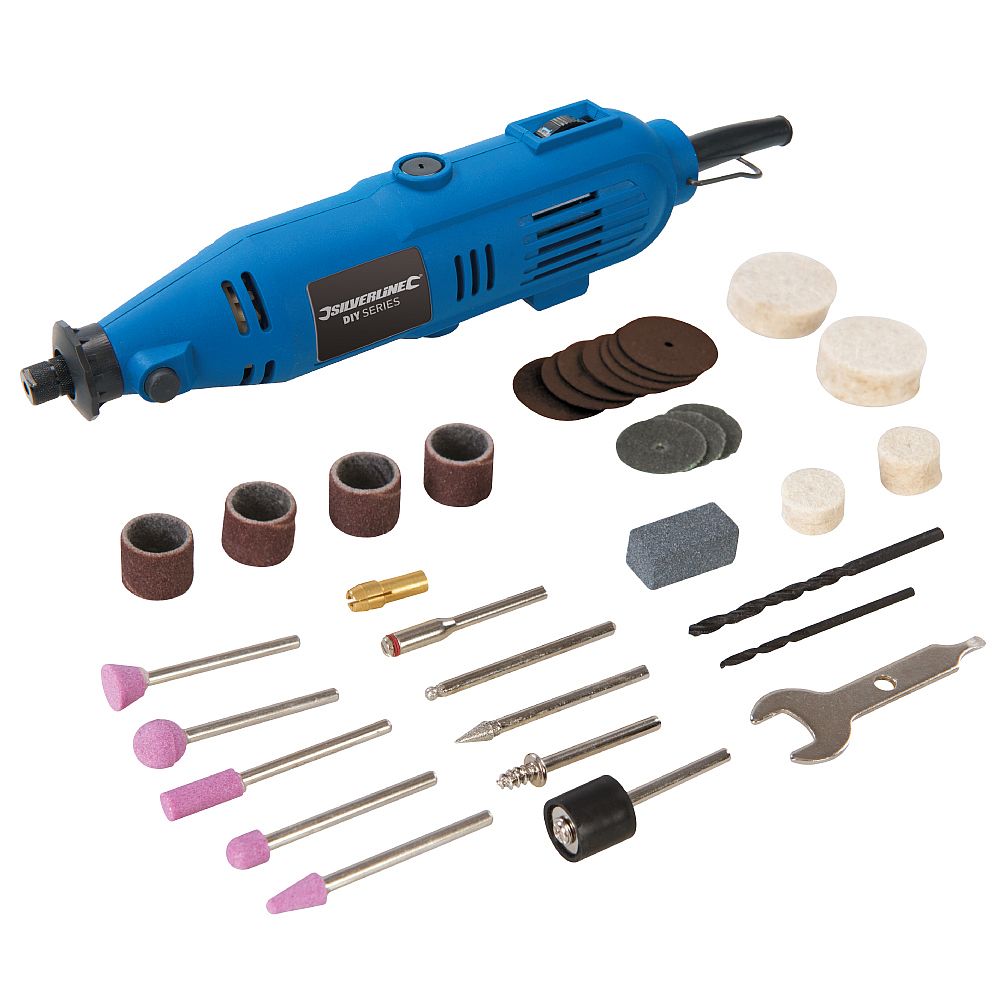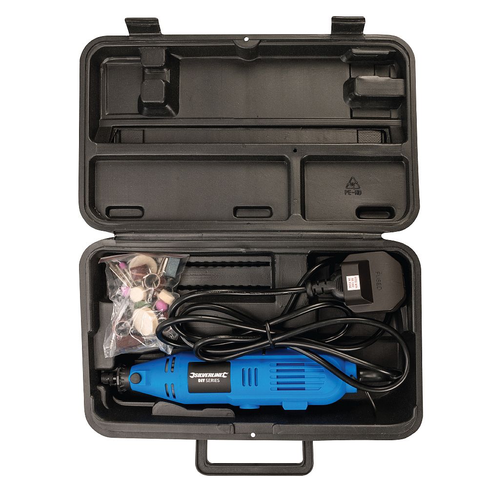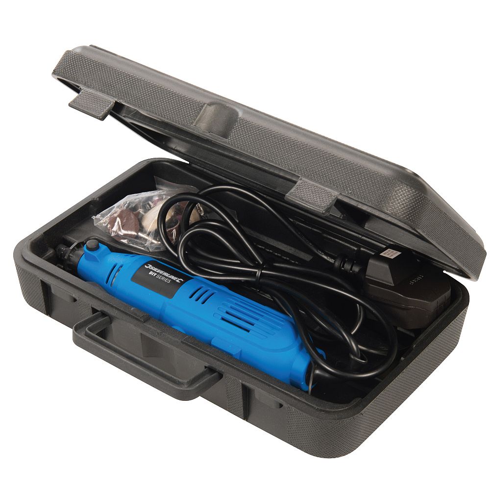 Multifunktions-Fräsmaschine mit Zubehör zum Feinschneiden, Schleifen, Polieren usw. Die Fräsmaschine hat die Möglichkeit der Drehzahlregelung und Spindelarretierung. Das Set enthält eine Fräsmaschine, Schleifrollen und -scheiben, Schleifspitzen, Abzeihscheiben, Drahtbürsten, Bohrer, 2 Zangen der Größen 2,25-2,35 mm und 3,1-3,2 mm, einen Schraubenschlüssel und eine Kunststoffbox.