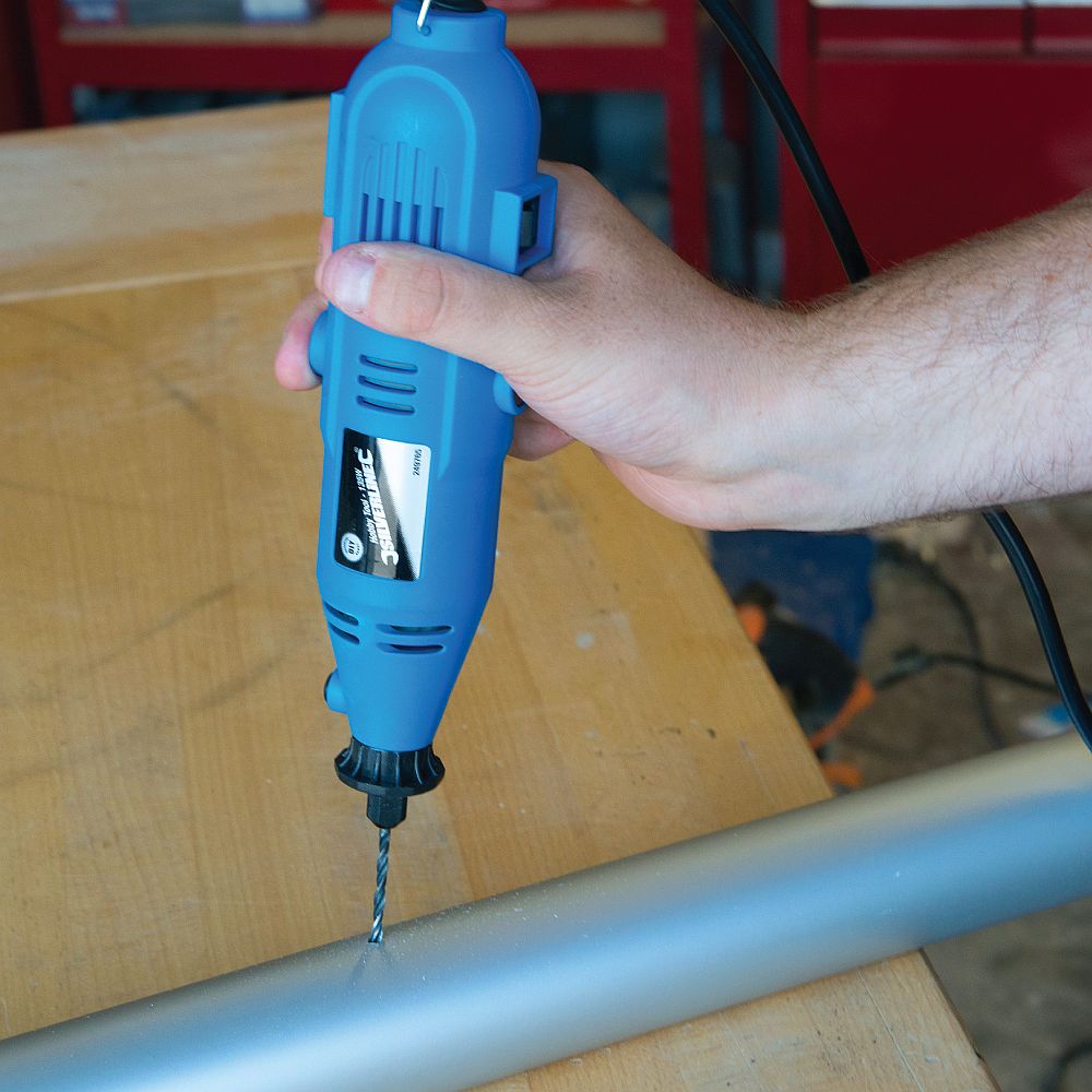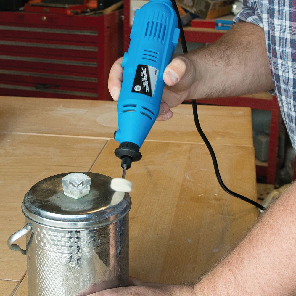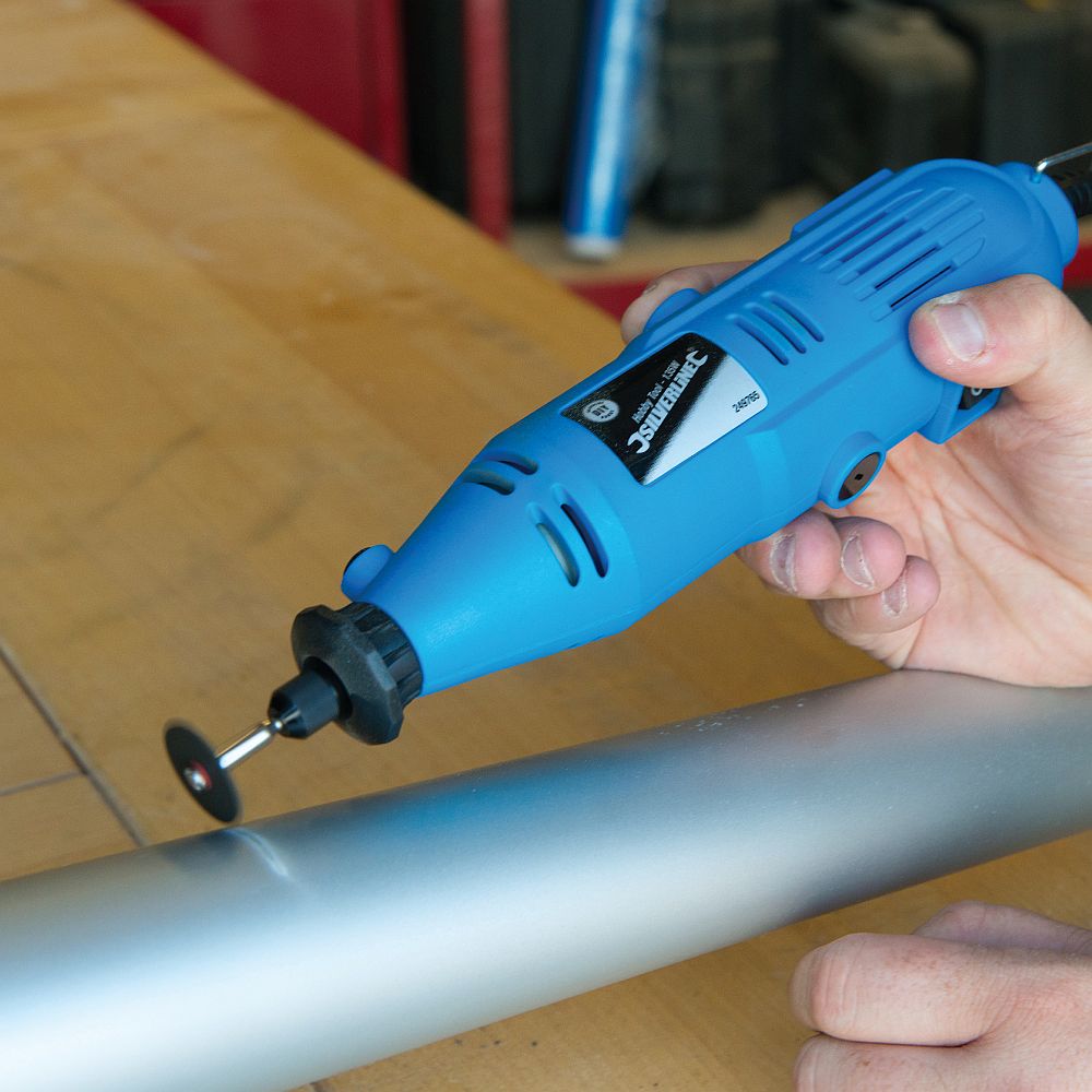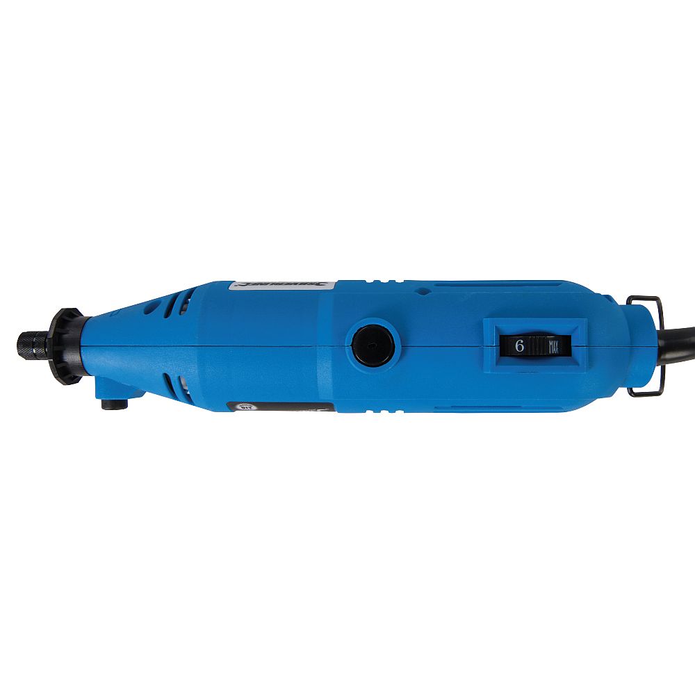 Multifunktions-Fräsmaschine mit Zubehör zum Feinschneiden, Schleifen, Polieren usw. Die Fräsmaschine hat die Möglichkeit der Drehzahlregelung und Spindelarretierung. Das Set enthält eine Fräsmaschine, Schleifrollen und -scheiben, Schleifspitzen, Abzeihscheiben, Drahtbürsten, Bohrer, 2 Zangen der Größen 2,25-2,35 mm und 3,1-3,2 mm, einen Schraubenschlüssel und eine Kunststoffbox.