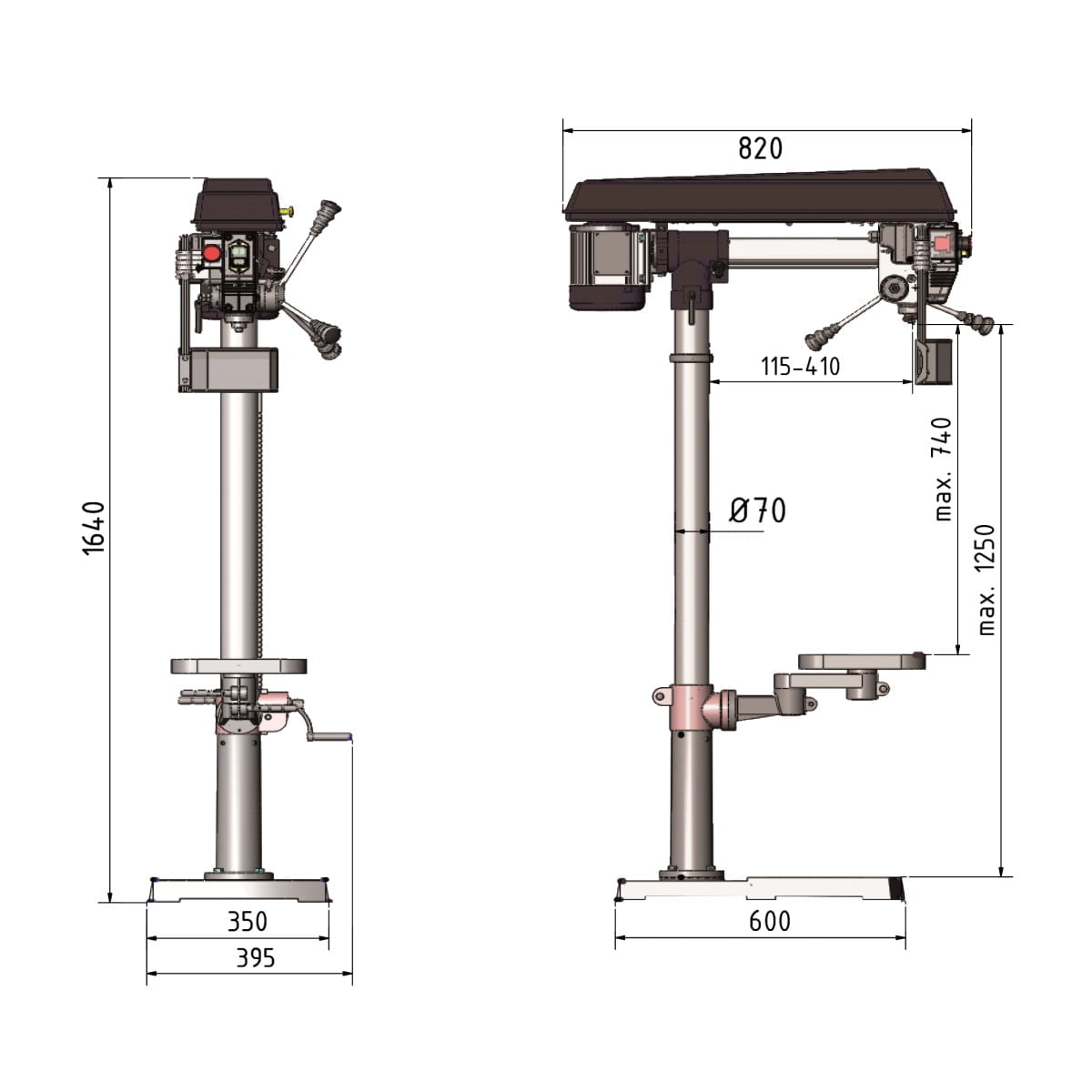 Maschinenfuß Abstand Spindel – Maschinenfuß max.: 1250 mm Arbeitsfläche Länge: 600 mm Arbeitsfläche Breite: 350 mm T-Nuten Größe: 14 mm