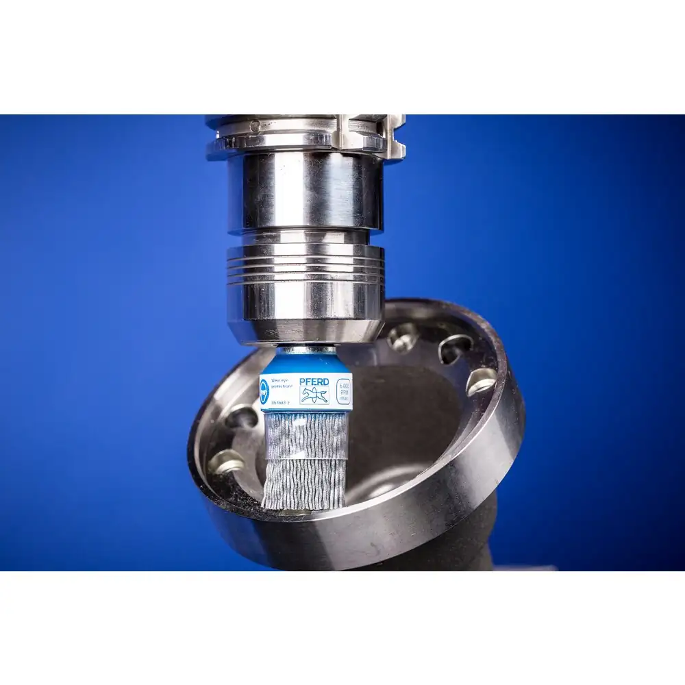 Eignen sich besonders gut zum Entgraten und zur Oberflächenbearbeitung auf stationären Maschinen. Composite-Bürsten von PFERD TOOLS sind speziell für den industriellen, automatisierten Einsatz entwickelt. Sie eignen sich für eine Vielzahl von Bearbeitungsaufgaben und sind durch ihre variablen Aufspannmöglichkeiten auf vielen verschiedenen Antriebsmaschinen einsetzbar. Dies bietet den Vorteil, dass die Produktion und Nacharbeiten des Werkstückes auf der selben Maschine durchgeführt werden können. Hierdurch lassen sich lohnintensive, manuelle Arbeiten reduzieren und reproduzierbare Ergebnisse mit kurzen Taktzeiten erzielen. Für einen effizienten Einsatz müssen zahlreiche Anwendungsparameter wie z. B. Bearbeitungszeit und Vorschub aufeinander abgestimmt und die dazu passende Bürste ausgewählt werden. Bürsten mit Siliciumcarbid (SiC) eignen sich besonders gut für Entgratarbeiten und zur Oberflächenverbesserung. Kunststoffbesatz hält Temperaturen bis 220° C stand.