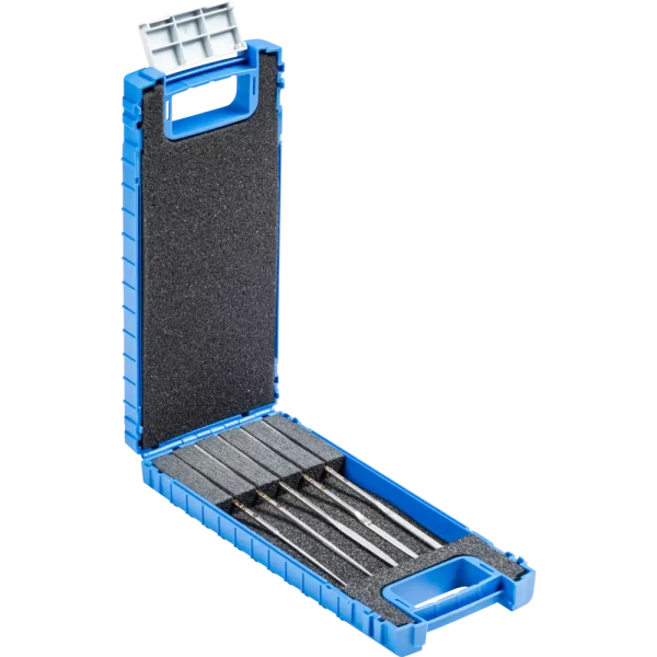 Das Diamant-Hemmungsfeilen-Set wird in einer praktischen bruchfesten Kunststoffbox geliefert, die die Werkzeuge vor Beschädigungen schützt. Diese eignet sich optimal zur Aufbewahrung, z. B. im Werkzeugwagen oder in der Werkbank. Diamant-Hemmungsfeilen werden im Werkzeugbau an kleinsten Profilen und in der Feinmechanik eingesetzt. Sie sind durch den geschmiedeten Schaft ohne Heft einsetzbar. Das Set beinhaltet je eine Feile des Profils halbrund, dreikant, flachstumpf, vierkant und rund. Mit der Korngröße D 25 können feinste Oberflächengüten erzielt werden.