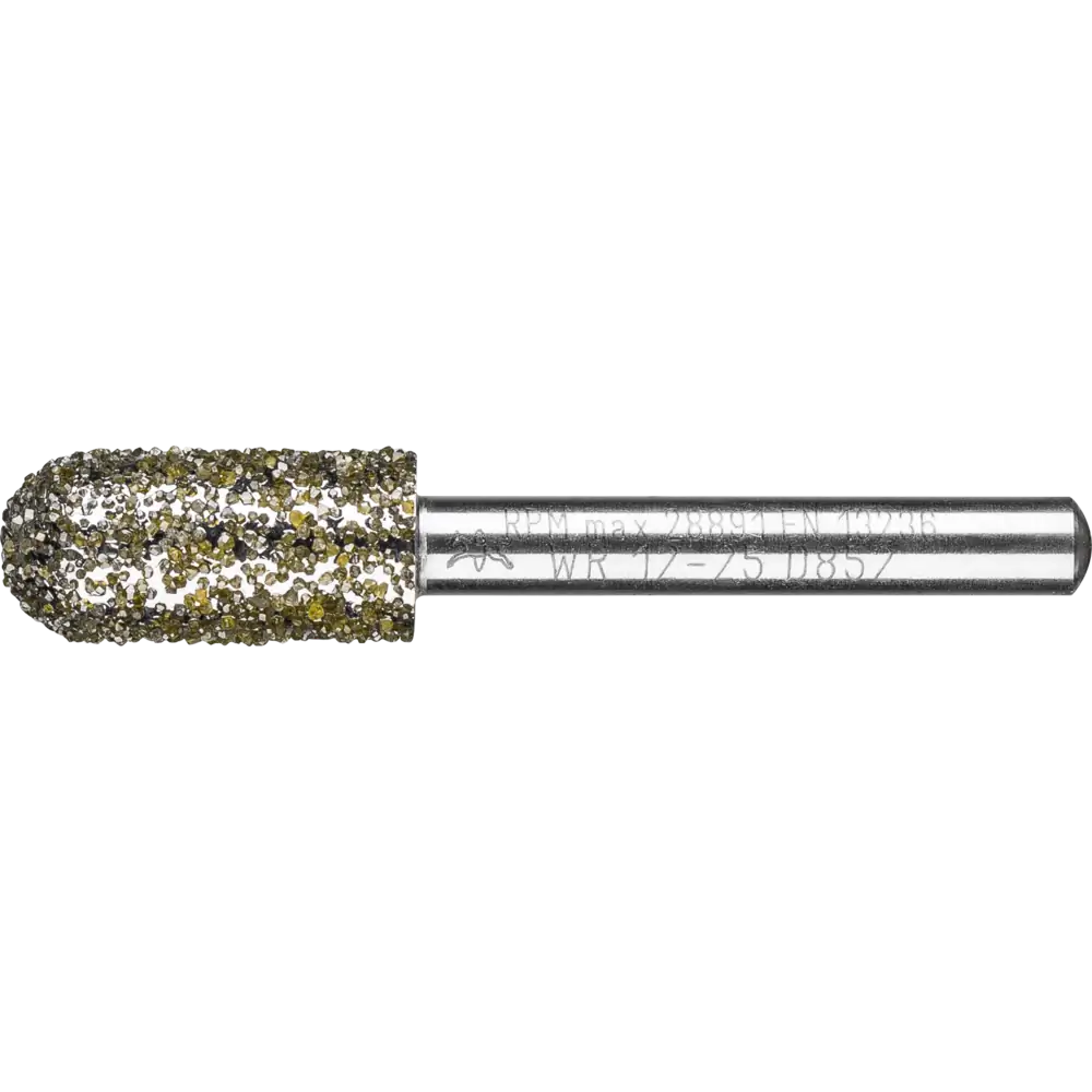 Galvanisch gebundene Diamant- und CBN-Schleifstifte werden sowohl im Nass- als auch im Trockenschliff eingesetzt. Diamant-Schleifstifte der Körnung D 852 eignen sich hervorragend für die Bearbeitung von Grau- und Sphäroguss (GG und GGG bzw. GJL und GJS). N = nicht abgesetzter Schaft