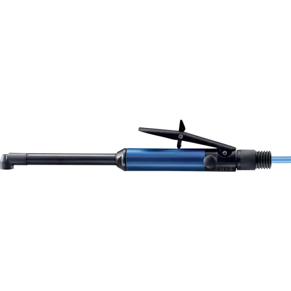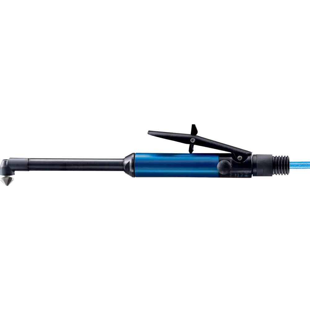 Der Antrieb ist mit einer Sechskant-Werkzeugaufnahme ausgestattet. Der Abluftaustritt des Druckluftantriebs befindet sich hinten. Sehr leise und robust. Optimal zum Entgraten von schwer zugänglichen Stellen, wie z. B. Löcher mit Querbohrungen. 1 m Ab- und 2,5 m Zuluftschlauch mit Gewindeanschluss 1/4“ außen und Stecktülle mit Gewinde (STGI).