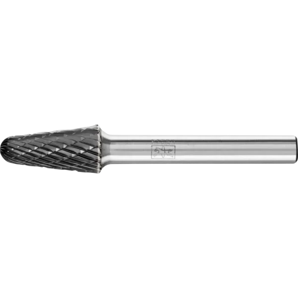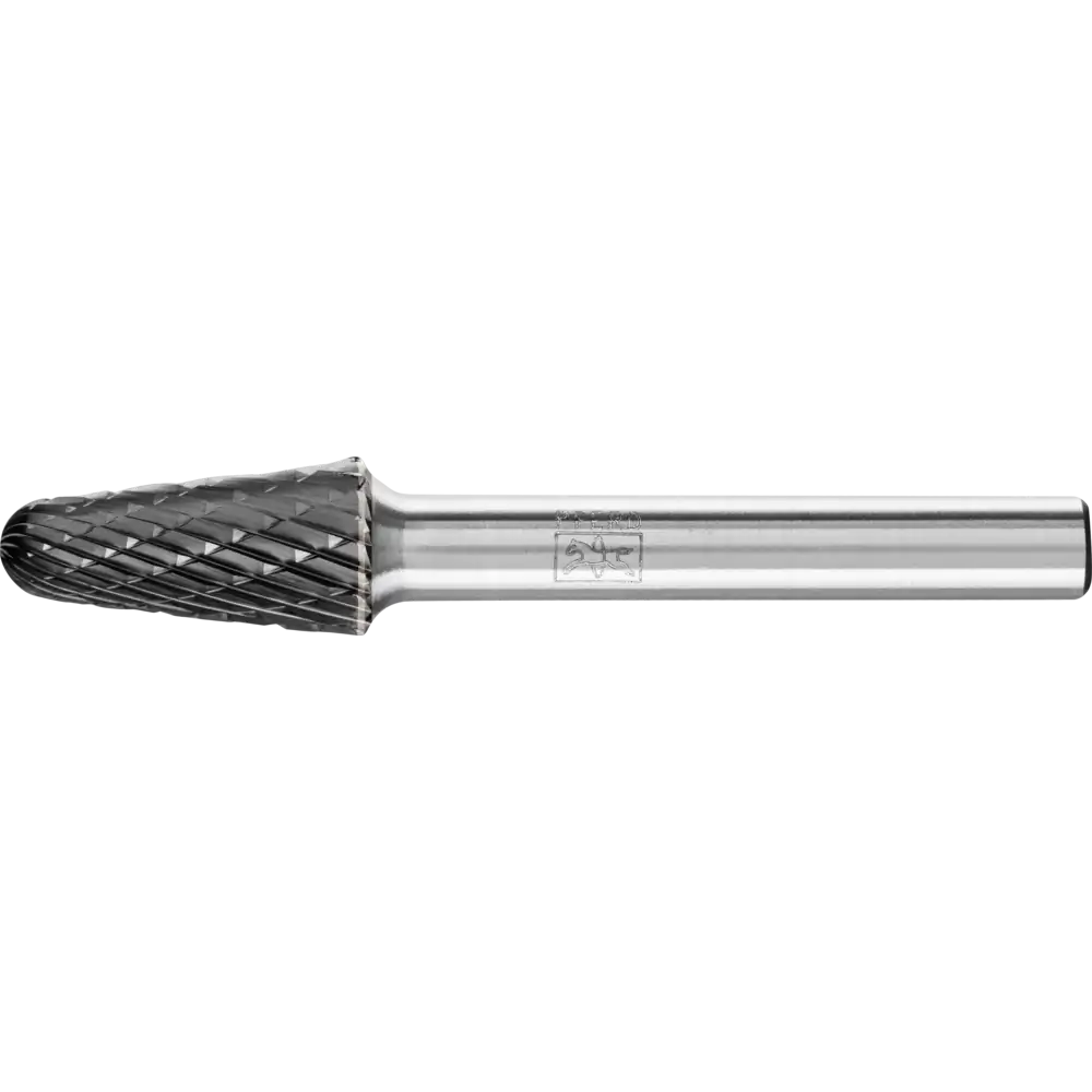 Zahnung 3 PLUS mit HICOAT-Beschichtung HC-FEP zeichnet sich durch eine hohe Härte und Verschleißfestigkeit aus. Sie erlaubt eine effektive Spanabfuhr durch verbesserte Gleiteigenschaften und ist sehr temperaturbeständig. Sie ermöglicht eine längere Standzeit der Werkzeuge sowie den Einsatz im höheren Schnittgeschwindigkeitsbereich im Vergleich zu unbeschichteten Frässtiften. Rundkegelförmiger Frässtift mit runder Kuppe nach DIN 8032 und Verzahnung nach DIN 8033.
