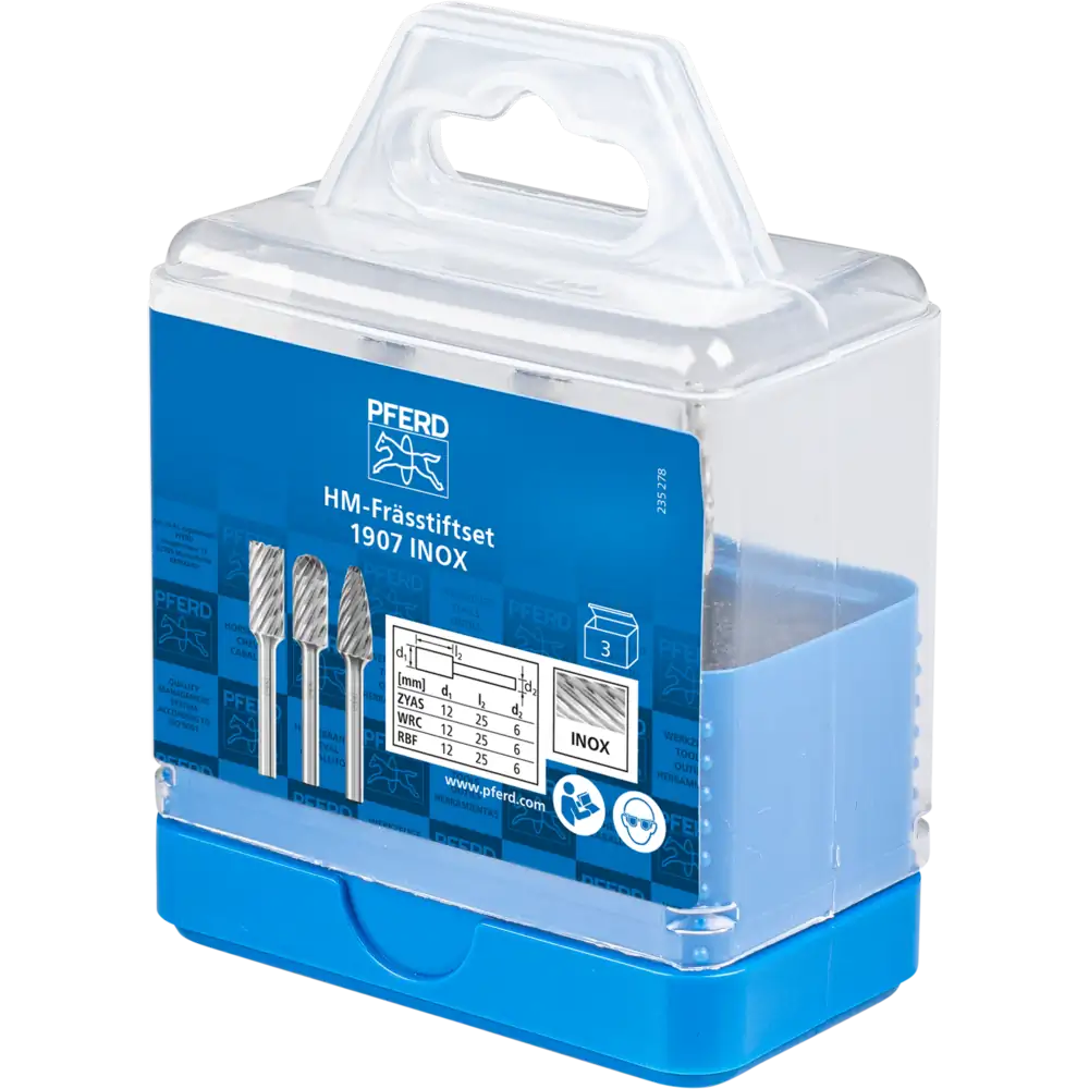 Mit der Zahnung INOX hat PFERD TOOLS innovative Frässtifte für die Bearbeitung von Edelstahl (INOX) entwickelt. Die Zahnung INOX zeichnet sich durch eine extrem hohe Zerspanungsleistung auf allen austenitischen, rost- und säurebeständigen Stählen aus. Sie erzeugt deutlich weniger Vibrationen als vergleichbare Kreuzverzahnungen. Das Set 1907 INOX enthält drei Hartmetallfrässtifte für die Bearbeitung von Edelstahl (INOX) in den gebräuchlichsten Formen und Abmessungen. Die bruchfeste Kunststoffbox schützt die Werkzeuge vor Schmutz und Beschädigung.