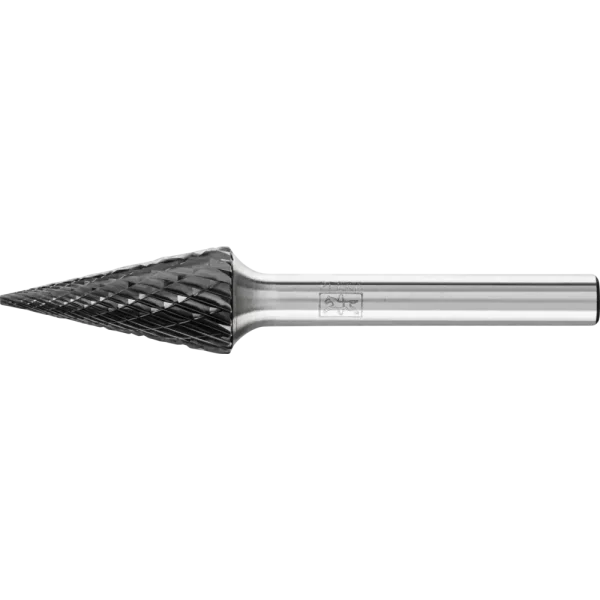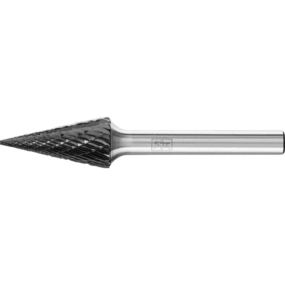 Zahnung 3 PLUS mit HICOAT-Beschichtung HC-FEP zeichnet sich durch eine hohe Härte und Verschleißfestigkeit aus. Sie erlaubt eine effektive Spanabfuhr durch verbesserte Gleiteigenschaften und ist sehr temperaturbeständig. Sie ermöglicht eine längere Standzeit der Werkzeuge sowie den Einsatz im höheren Schnittgeschwindigkeitsbereich im Vergleich zu unbeschichteten Frässtiften. Spitzkegelförmiger Frässtift nach DIN 8032 mit Verzahnung nach DIN 8033, Spitze abgeflacht.