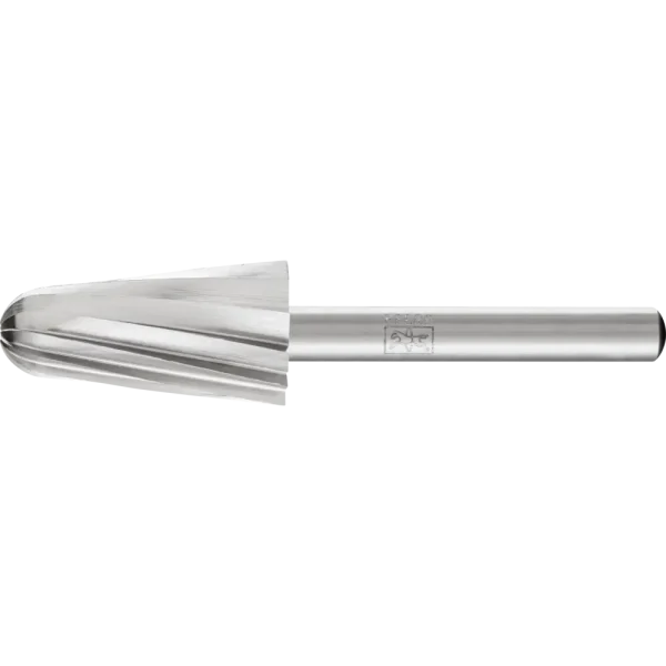 Die Zahnung ALU eignet sich besonders gut zur Zerspanung von weichen NE-Metallen, Messing, Kupfer, Aluminiumlegierungen, Kunststoffen, faserverstärkten Kunststoffen und Gummi. HSS-Frässtifte mit der Zahnung ALU können in einem Drehzahlbereich je nach Frässtiftdurchmesser von 4.000 bis 6.000 RPM eingesetzt werden. Rundkegelförmiger Frässtift.