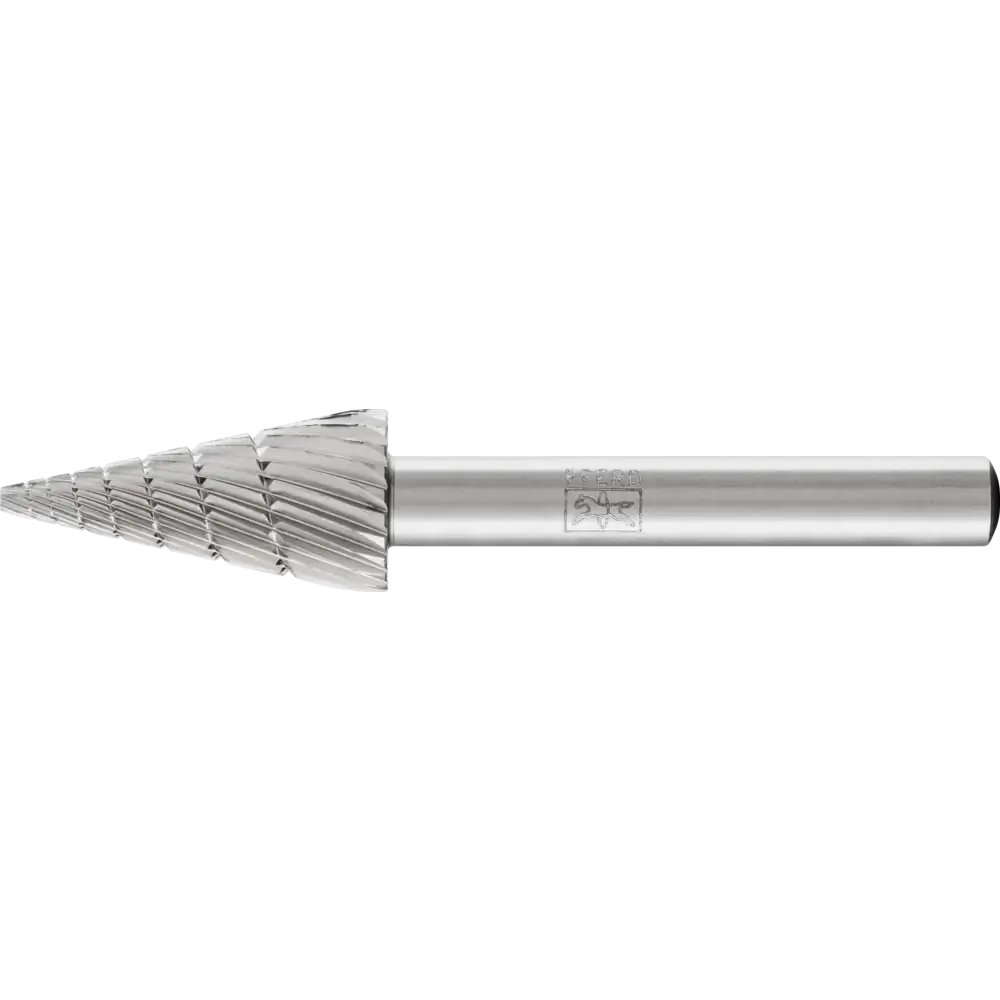 Zahnung 3 ist mit Spanbrechern versehen und eignet sich besonders gut zur Zerspanung von Stahl, Stahlguss und Gusseisen. Sie wird in einem Drehzahlbereich je nach Frässtiftdurchmesser von 1.200 bis 7.900 RPM eingesetzt. Spitzkegelförmiger Frässtift, Spitze abgeflacht.