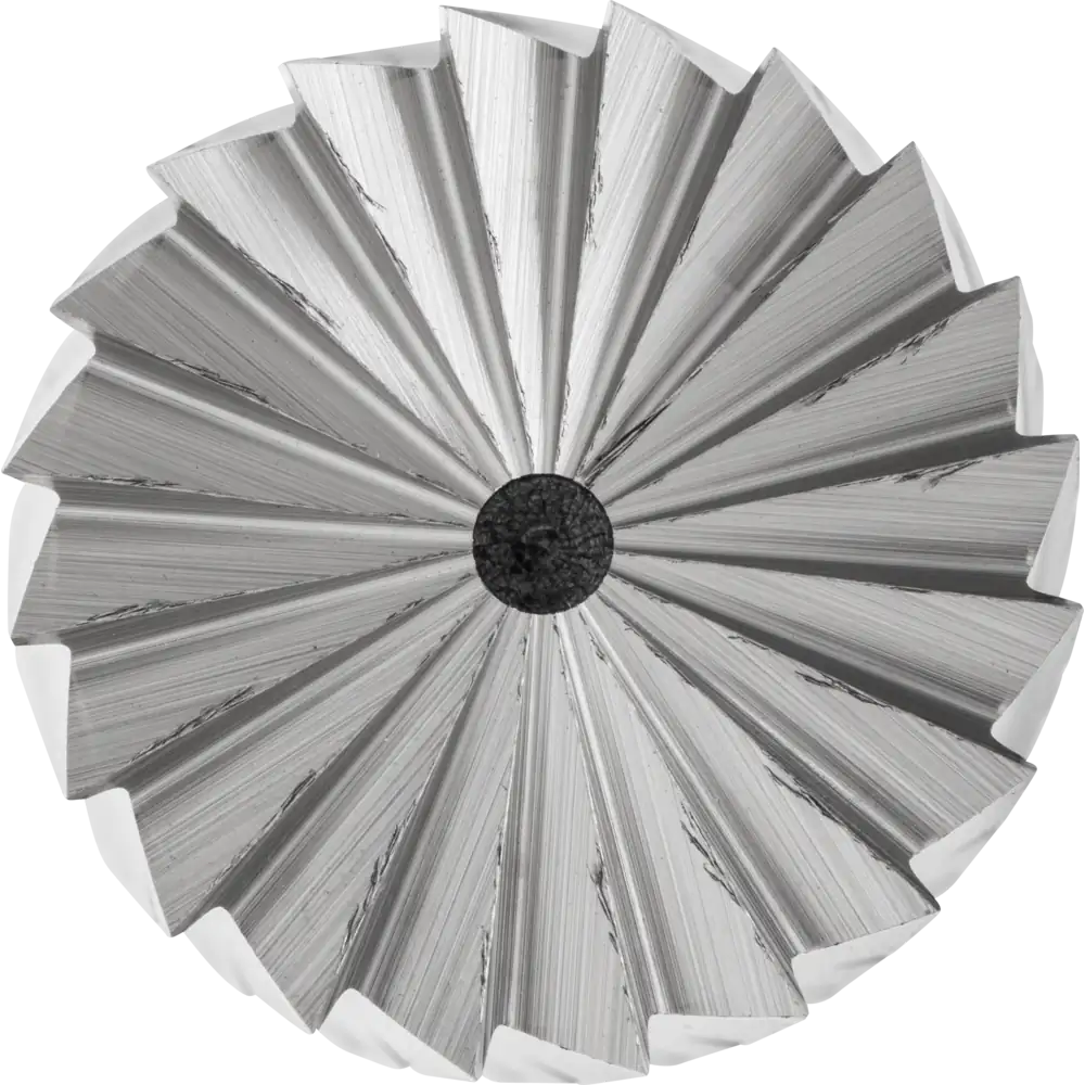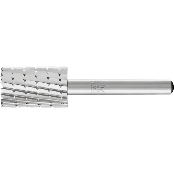 Zahnung 2 ist mit Spanbrechern versehen und eignet sich besonders gut zur Zerspanung von Stahl, Stahlguss und Gusseisen, Edelstahl (INOX), NE-Metallen und Kunststoffen. Sie wird in einem Drehzahlbereich je nach Frässtiftdurchmesser von 1.200 bis 13.200 RPM eingesetzt. Zylindrischer Frässtift mit Stirnverzahnung.