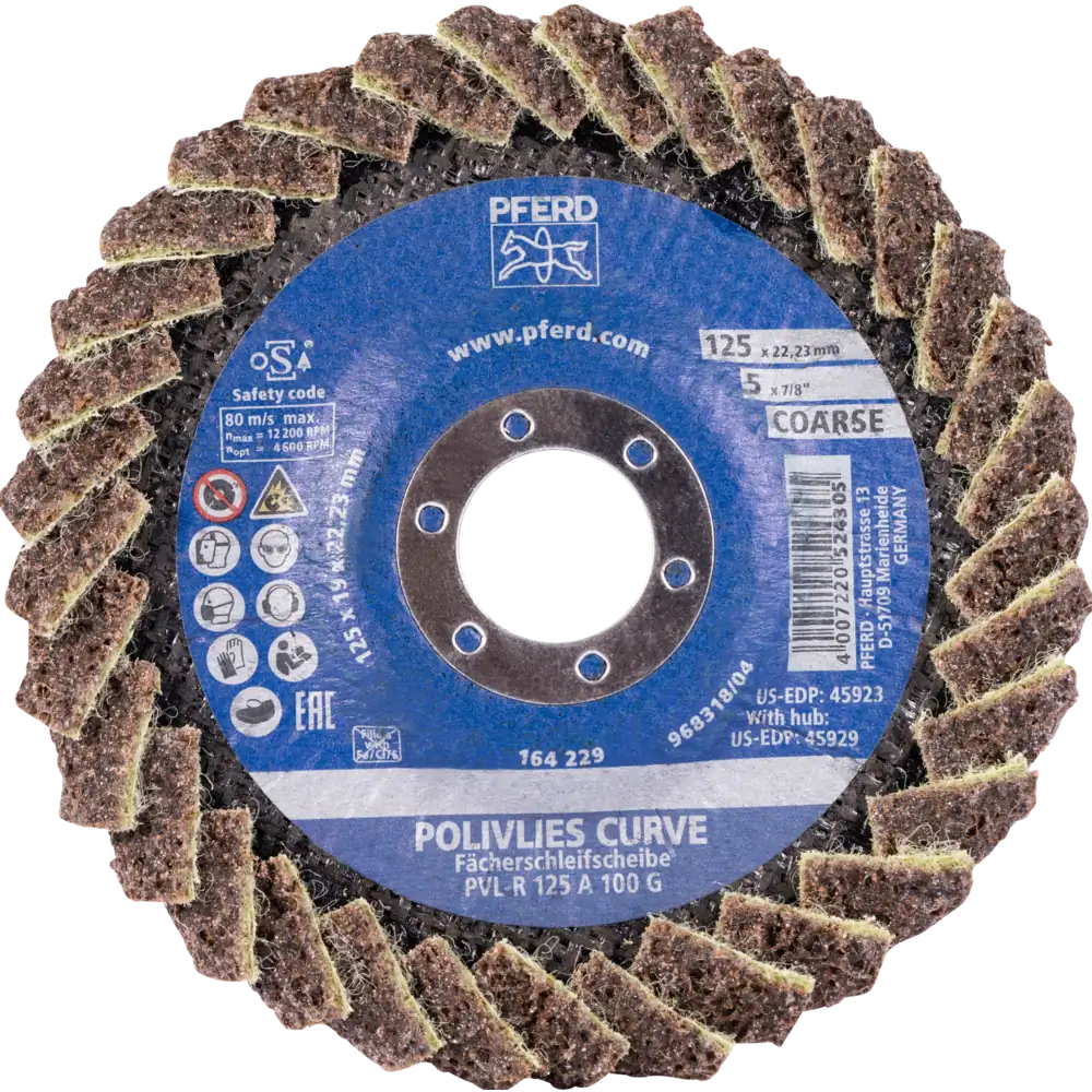 Für den universellen Einsatz von Grob- bis Feinschliff in Industrie und Handwerk. Die Ausführung Curve ist sowohl auf der Schleifseite als auch auf der Rückseite sowie am Radius zu verwenden. Die POLIVLIES-Fächerscheibe PVL-R wurde speziell für die Kehlnahtbearbeitung entwickelt. Sie ist die weltweit einzige Fächerscheibe, die sowohl auf der Schleifseite als auch auf der Rückseite sowie am Radius mit Lamellen belegt ist. Die POLIVLIES-Fächerscheibe PVL-R von PFERD TOOLS ist in vielen Ländern der Welt patentiert. POLIVLIES-Korngröße 100 G = grob (gelbbraun)