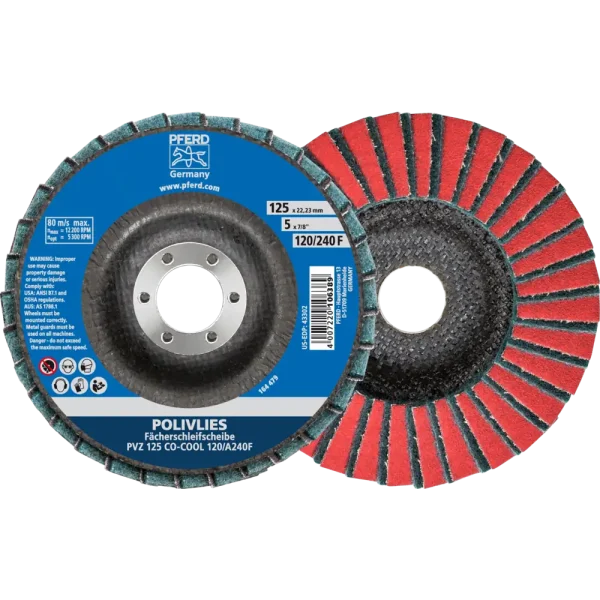 Schreibe die erste Rezension für „Pferd Tools POLIVLIES-Fächerscheibe PVZ Keramik Ø 125 mm Bohrung 22,23 mm CO-COOL120/A240F für Feinschliff“