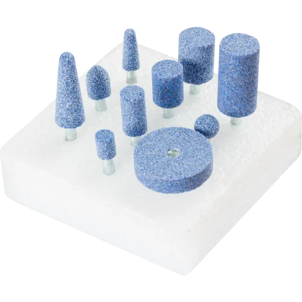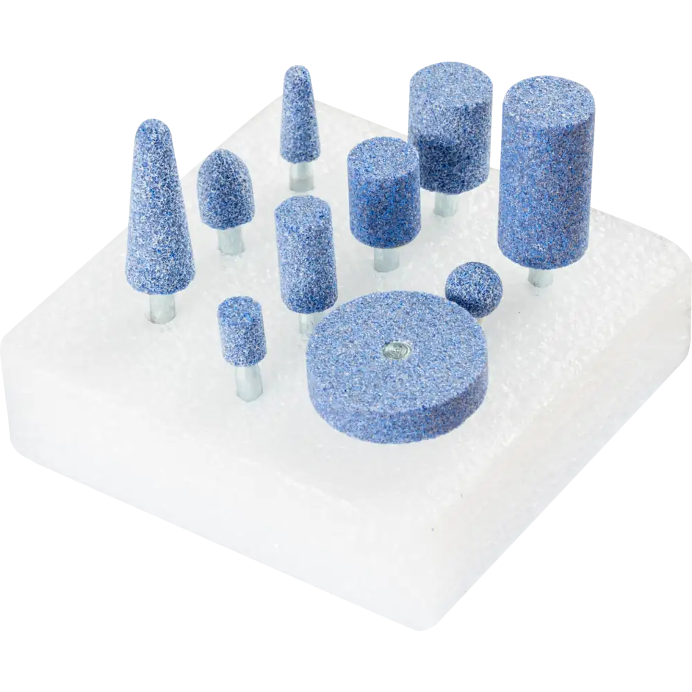 Das Set enthält 10 Schleifstifte mit Schaftdurchmesser 6 mm in den gebräuchlichsten Formen und Abmessungen.