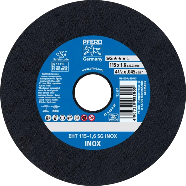 Das breite Programm der Leistungs-Linie SG bietet für jede Anwendung und jeden Werkstoff eine leistungsstarke Werkzeuglösung. Werkzeuge der Leistungs-Linie SG erzielen beste Arbeitsergebnisse bei höchster Wirtschaftlichkeit. Trennscheibe für Edelstahl (INOX) mit hoher Trennleistung und höchster Standzeit. Werker in aller Welt vertrauen Blau und wählen die dünnen Trennscheiben von PFERD TOOLS. Das PFERD TOOLS Programm bietet dünne Trennscheiben in vielen verschiedenen Ausführungen und somit für jede Anwendung die passende Werkzeuglösung – ergonomisch optimiert, effizient und auf höchstem Sicherheitsniveau. Die dünnen Trennscheiben von PFERD TOOLS zeichnen sich durch ihre besondere Bindungsrezeptur aus. Die intensive Forschungs- und Entwicklungsarbeit und die gezielte Umsetzung in den hochmodernen Fertigungsstätten garantieren die hohen Qualitäts- und Sicherheitsstandards von PFERD TOOLS.