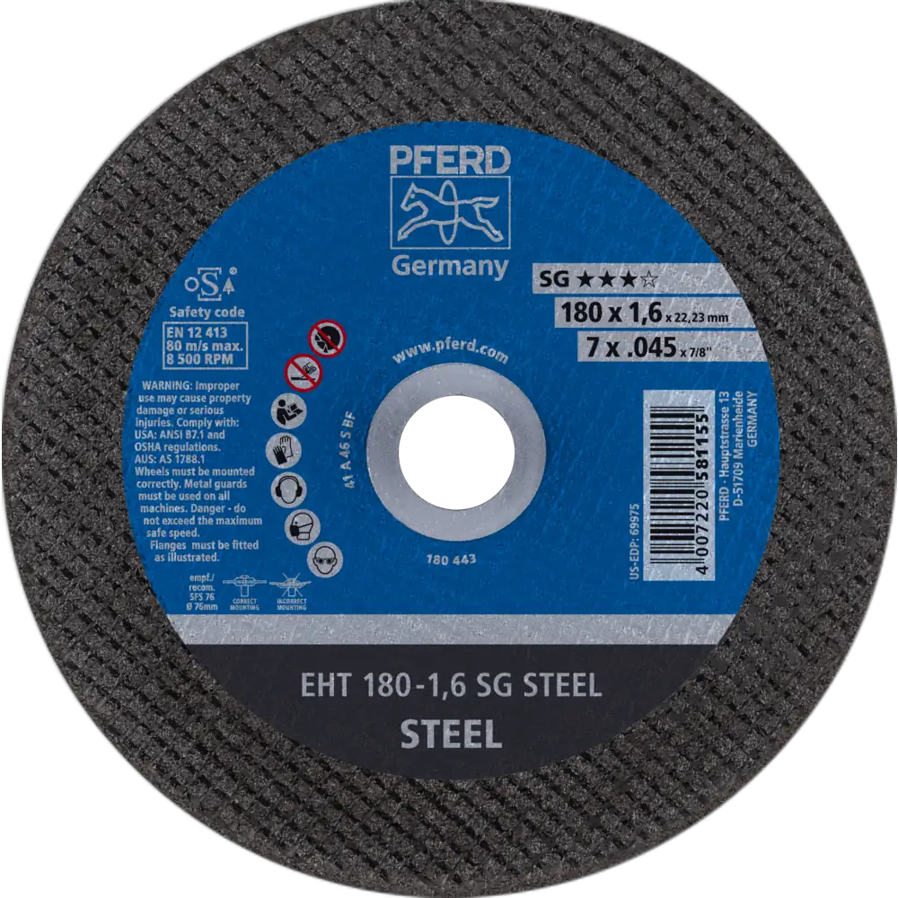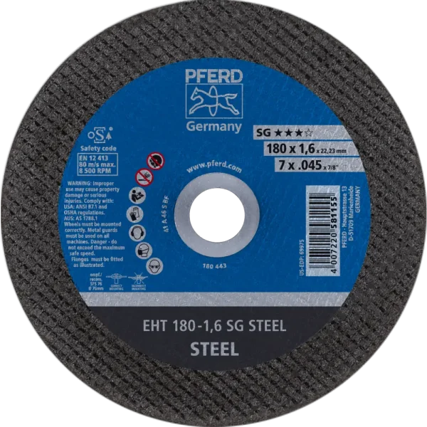 Das breite Programm der Leistungs-Linie SG bietet für jede Anwendung und jeden Werkstoff eine leistungsstarke Werkzeuglösung. Werkzeuge der Leistungs-Linie SG erzielen beste Arbeitsergebnisse bei höchster Wirtschaftlichkeit. Trennscheibe für Stahl mit hoher Trennleistung und höchster Standzeit. Werker in aller Welt vertrauen Blau und wählen die dünnen Trennscheiben von PFERD TOOLS. Das PFERD TOOLS Programm bietet dünne Trennscheiben in vielen verschiedenen Ausführungen und somit für jede Anwendung die passende Werkzeuglösung – ergonomisch optimiert, effizient und auf höchstem Sicherheitsniveau. Die dünnen Trennscheiben von PFERD TOOLS zeichnen sich durch ihre besondere Bindungsrezeptur aus. Die intensive Forschungs- und Entwicklungsarbeit und die gezielte Umsetzung in den hochmodernen Fertigungsstätten garantieren die hohen Qualitäts- und Sicherheitsstandards von PFERD TOOLS.