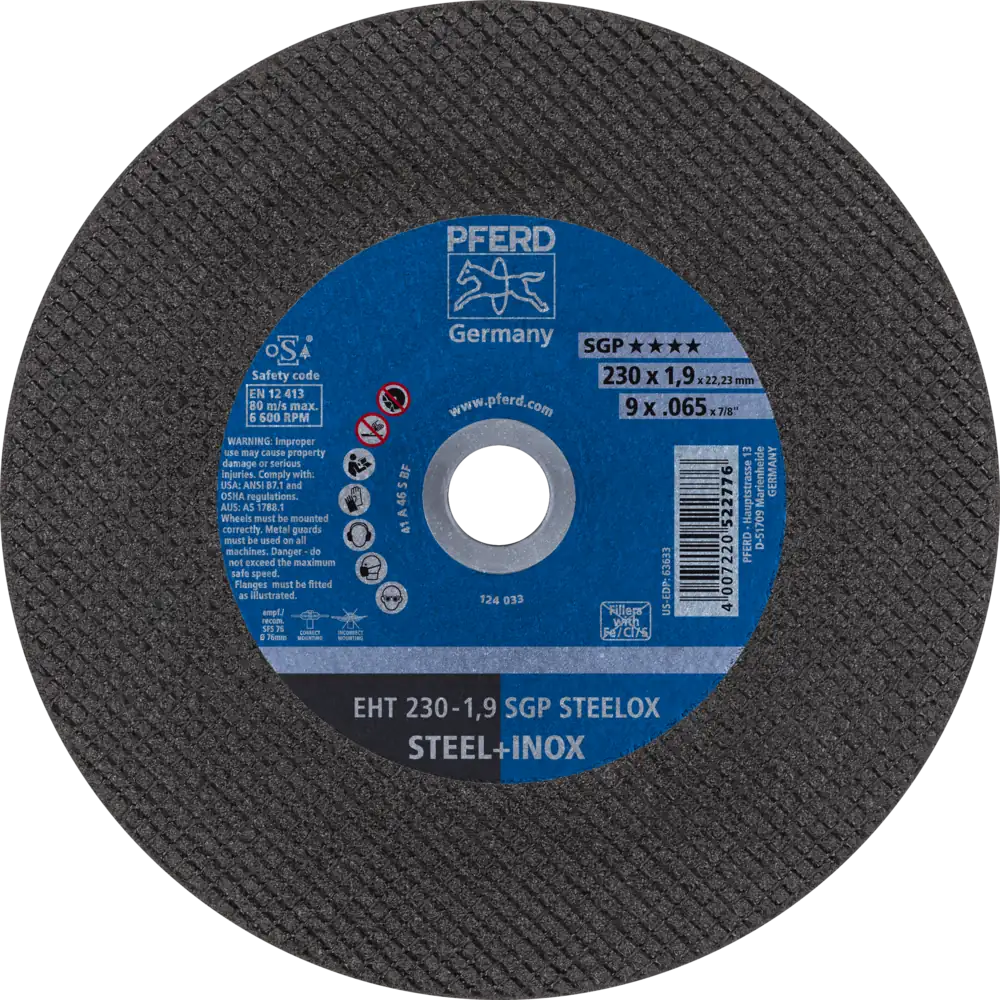 Werkzeuge der Spezial-Linie SGP sind speziell für besondere Aufgabenstellungen entwickelt und bieten dem Anwender entscheidende Vorteile gegenüber herkömmlichen Produkten. Weiter umfasst die Spezial-Linie SGP Werkzeuge, die aufgrund ihrer besonders hohen Leistung im Einsatz ultimative Wirtschaftlichkeit bieten. Trennscheibe für Stahl und Edelstahl (INOX) mit hoher Trennleistung und herausragender Standzeit. Speziell optimiert für den Einsatz auf dünnen Blechen und Profilen. Werker in aller Welt vertrauen Blau und wählen die dünnen Trennscheiben von PFERD TOOLS. Das PFERD TOOLS Programm bietet dünne Trennscheiben in vielen verschiedenen Ausführungen und somit für jede Anwendung die passende Werkzeuglösung – ergonomisch optimiert, effizient und auf höchstem Sicherheitsniveau. Die dünnen Trennscheiben von PFERD TOOLS zeichnen sich durch ihre besondere Bindungsrezeptur aus. Die intensive Forschungs- und Entwicklungsarbeit und die gezielte Umsetzung in den hochmodernen Fertigungsstätten garantieren die hohen Qualitäts- und Sicherheitsstandards von PFERD TOOLS.