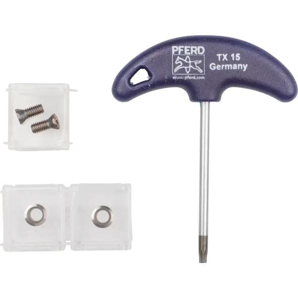 Mit den Service-Sets von PFERD TOOLS können die gängigsten Einzelteile bei Verlust oder Beschädigung ausgetauscht werden. PFERD TOOLS bietet sowohl ein Reparaturset für Lochsägen-Schäfte als auch Service-Sets für die High Speed Disc ALUMASTER und den High Speed Torus Cutter an. Zum Austausch einzelner Wendeschneidplatten an der High Speed Disc ALUMASTER. Das Set beinhaltet zwei Wendeschneidplatten, zwei Schrauben und einen Innensechsrund-Schraubendreher.