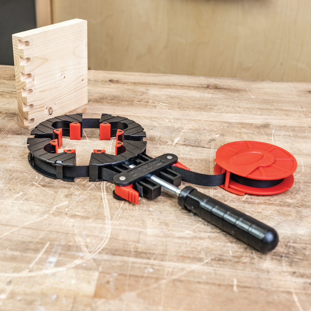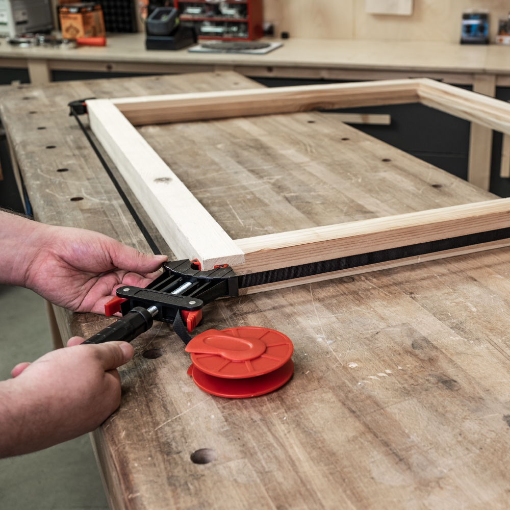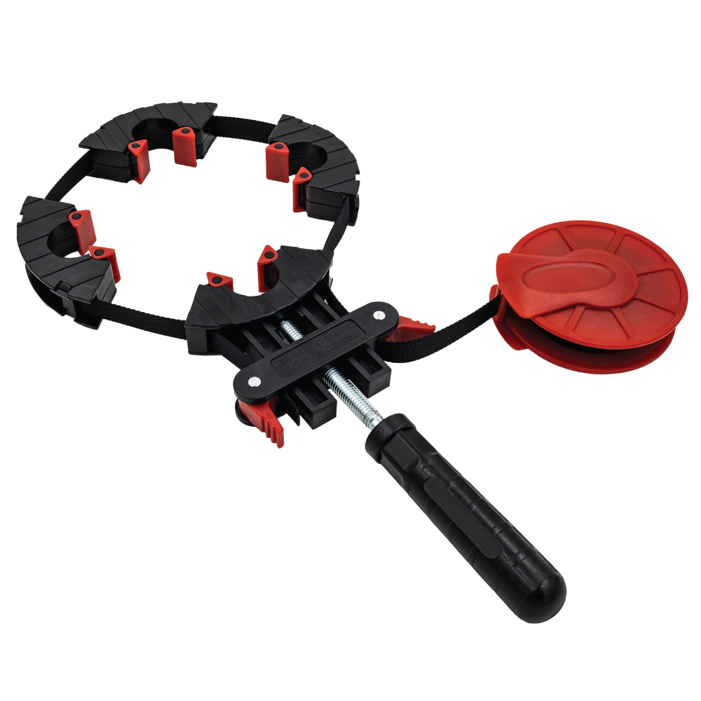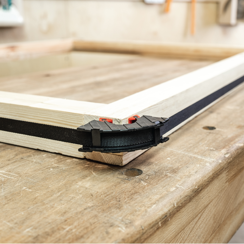 Ein tolles Werkzeug für die Herstellung von kleinen und großen Rahmen in einer kleinen Werkstatt oder für Heimwerker – Ausgestattet mit einem 4 Meter langen Nylon-Spannband, einer Bandwinde, einer Schraubenspannvorrichtung und vier schwenkbaren Ecksegmenten, um den Rahmen perfekt zu spannen. Mit dieser Vorrichtung können Sie rechteckige Rahmen oder sogar unregelmäßig geformte Rahmen spanen. Nach der Applikation des Klebers wird der Rahmen einfach in den Rahmenspanner befestigt und gespannt.
