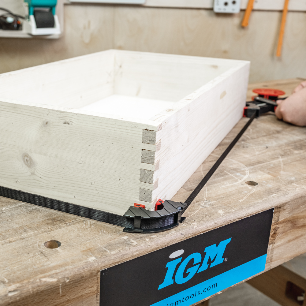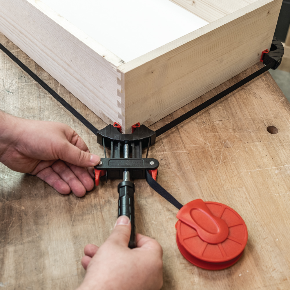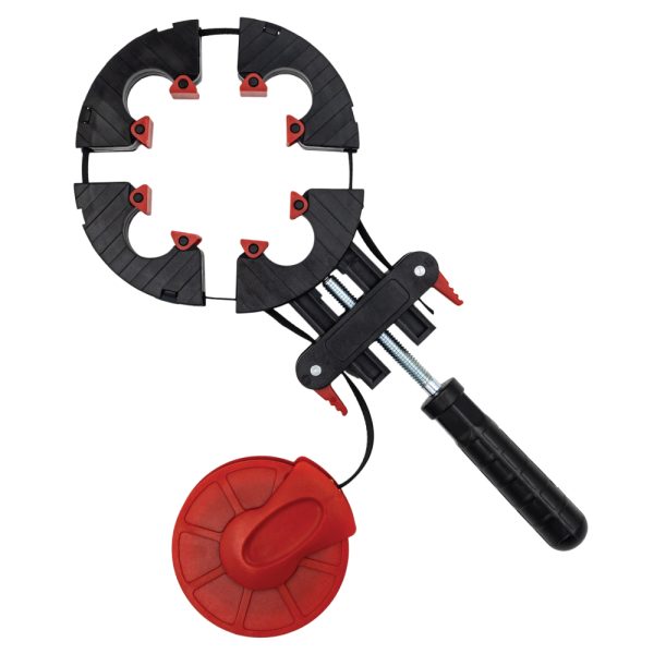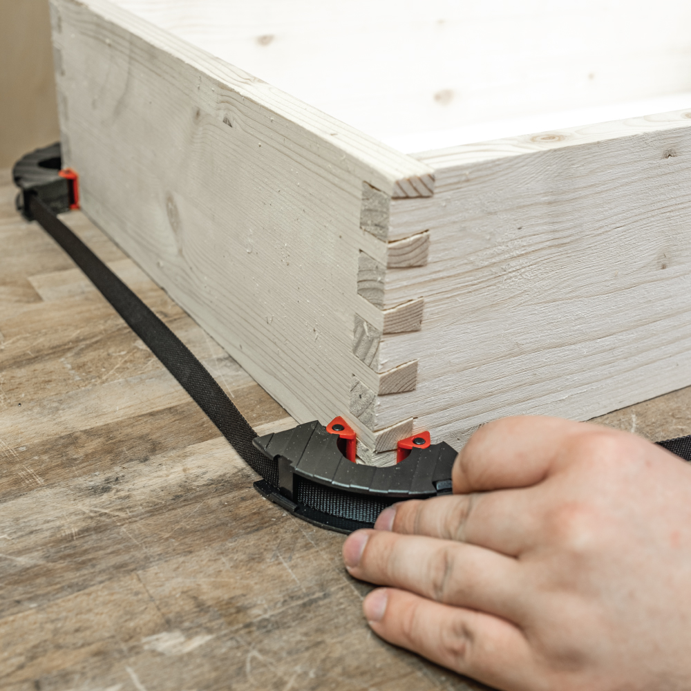Ein tolles Werkzeug für die Herstellung von kleinen und großen Rahmen in einer kleinen Werkstatt oder für Heimwerker – Ausgestattet mit einem 4 Meter langen Nylon-Spannband, einer Bandwinde, einer Schraubenspannvorrichtung und vier schwenkbaren Ecksegmenten, um den Rahmen perfekt zu spannen. Mit dieser Vorrichtung können Sie rechteckige Rahmen oder sogar unregelmäßig geformte Rahmen spanen. Nach der Applikation des Klebers wird der Rahmen einfach in den Rahmenspanner befestigt und gespannt.