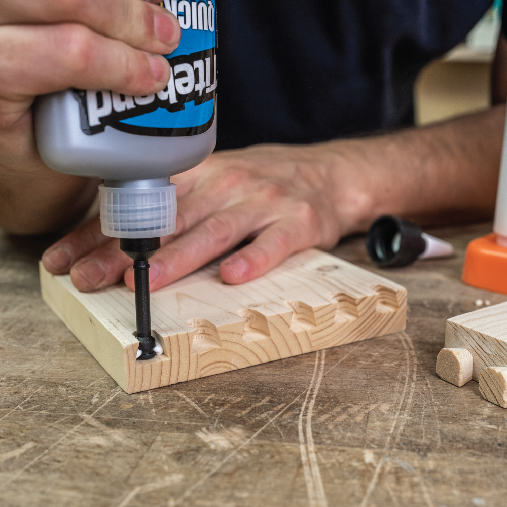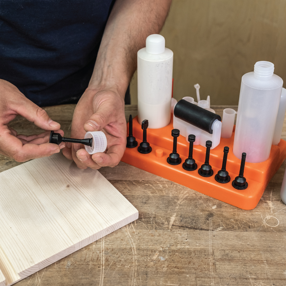 Der IGM Satz zum Auftrange von Kleber mit dreizehn verschiedenen Aufsätzen erleichtert Ihnen das Verkleben von Holzteilen, egal ob gefräst oder beim Verbinden mit Stiften oder Latten. Zusätzlich zu diesen Aufsätzen enthält das Set 2 Flaschen für jeden Kleber, 2 Verschlüsse für die Aufsätze, einen Verschluss für die Flasche und einen praktischen Ständer, auf dem Sie alle Teile aufbewahren können. Das Gewinde der Aufsätze ist mit der Titebond 237 ml Plastikflasche kompatibel. Sie können alle Aufsätze direkt auf die Flasche Titebond-Kleber schrauben.