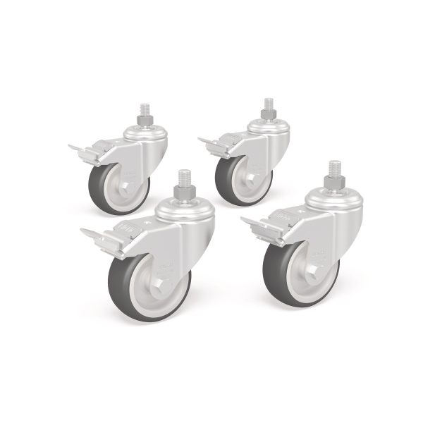 Die Lenkrollen mit Feststellbremse von Bernd Siegmund GmbH, ansässig in Oberottmarshausen, Deutschland, können bis zu 250 kg tragen und wiegen ungefähr 2,4 kg.