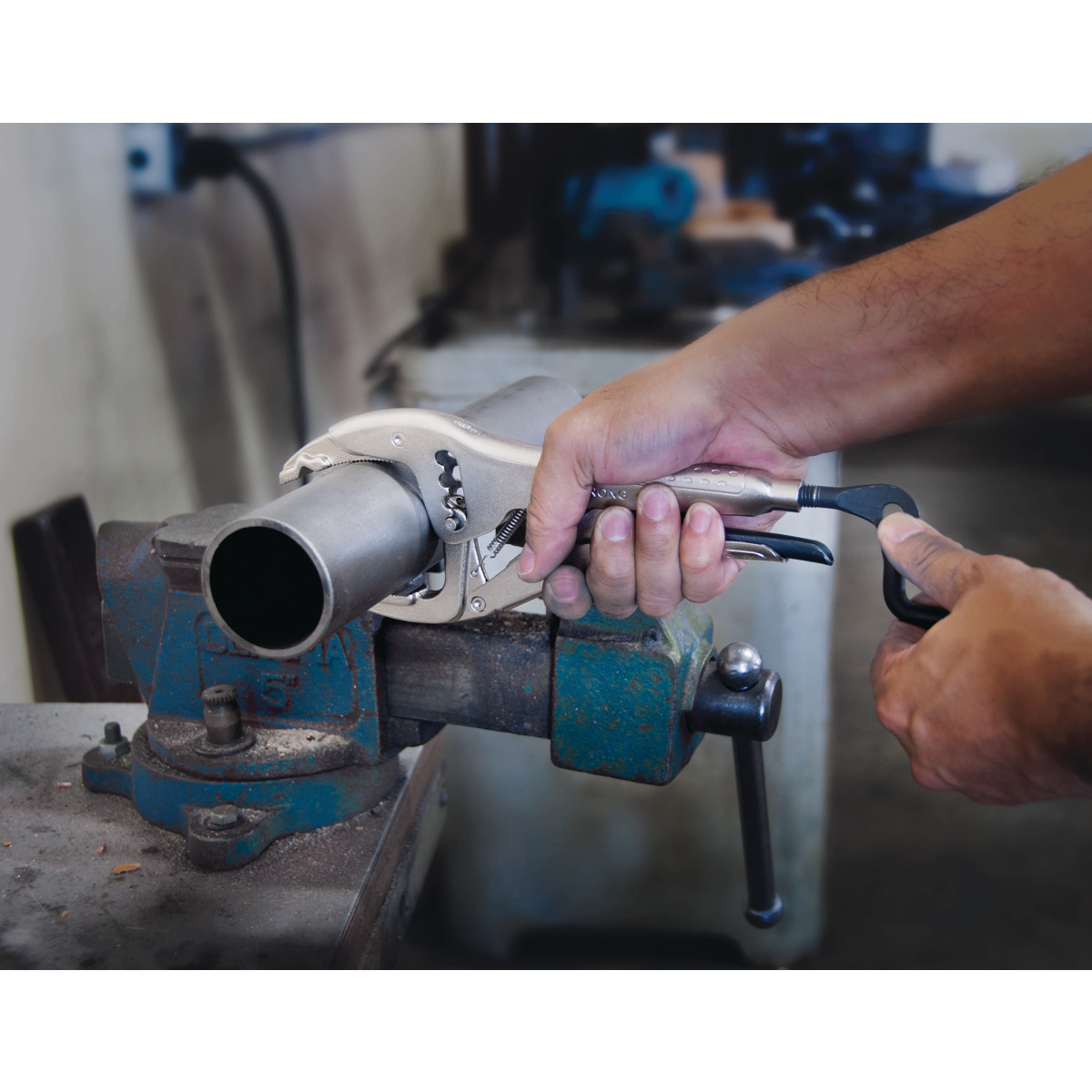 Die von der Stürmer Maschinen GmbH hergestellte Zange verfügt über eine Kurbel zum schnellen Öffnen, Schließen und Einstellen, einen Schnellentriegelungshebel, gezackte Zangenbacken für verbesserten Halt und eine V-förmige Kerbe zum Einspannen kleiner Teile. Mit einer Ausladung von 64 mm und einer variablen Spannweite von 6 mm bis 75 mm wiegt diese Zange etwa 0,7 kg.