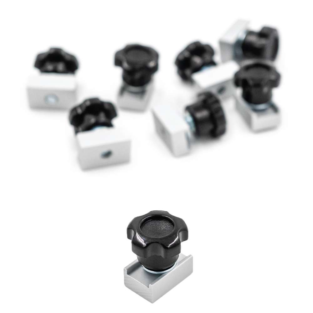 Dieses Set wurde entwickelt, um die Einsatzmöglichkeit von Klemmschienen zu erweitern. Legen Sie zwei Schienen übereinander und befestigen Sie sie mit den vier T-Verbindungsstücken. Befestigen Sie die zusammengefügten Schienen mit den unteren Backen an die Tischplatte. Mit dem Klemmsystem der oberen Klemmschiene wir das Werkstück befestigt. Dank des niedrigen Profils der Backen ist die Arbeitsfläche für die Holzbearbeitung, z. B. mit Oberfräse, Schleifmaschine usw., leicht zugänglich. Die beiden miteinander verbundenen Klemmschienen können jederzeit demontiert und separat wieder verwendet werden. Ein Satz von 8 Verbindungsstücken verbindet zwei Paare von Schienen.