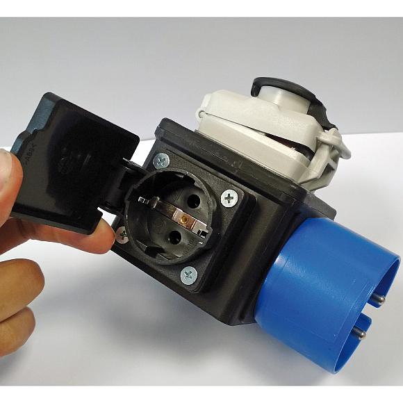 Er ist mit einer Steckdose und einem Stecker, einer Stopptaste für die sofortige Abschaltung im Notfall, einer Starttaste und einer Abschalttaste ausgestattet.