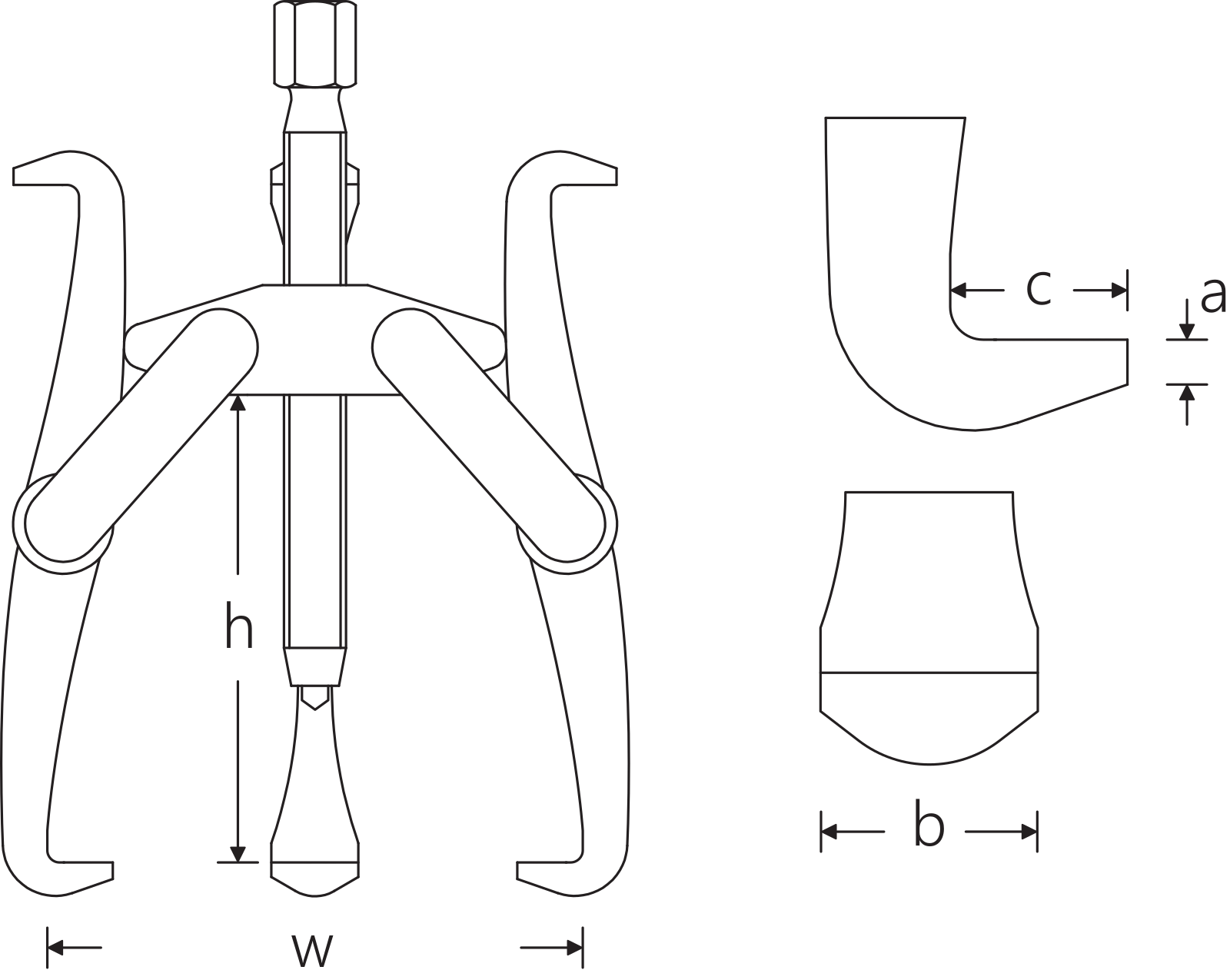 • beidseitige Anwendung der Abzugshaken: schmales Hakenende (20 mm) für enge Bauräume, breites Hakenende (24 mm) mit Schlitz (8 mm) zum Abziehen von Scheiben oder Zahnrädern mit Zuhilfenahme von 8 mm Schrauben