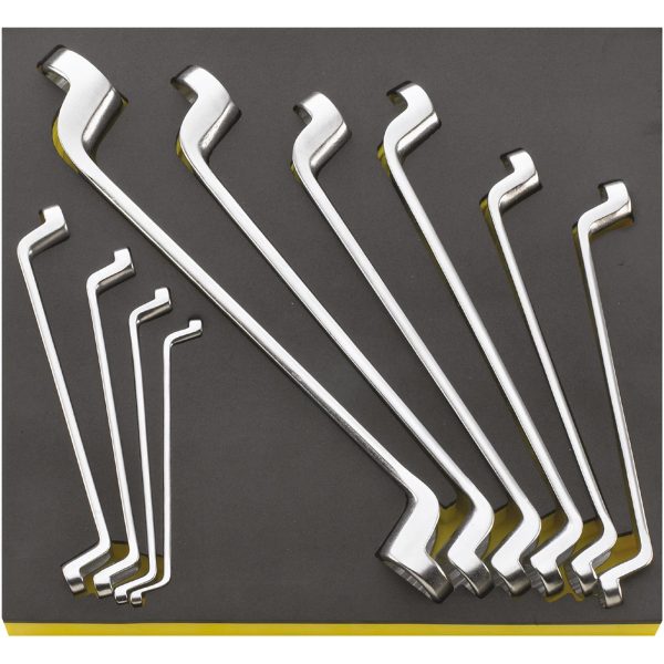- Hochwertiger Doppelringschlüssel-Satz, tief gekröpft, mit metrischen, ungleichen Schlüsselweiten.