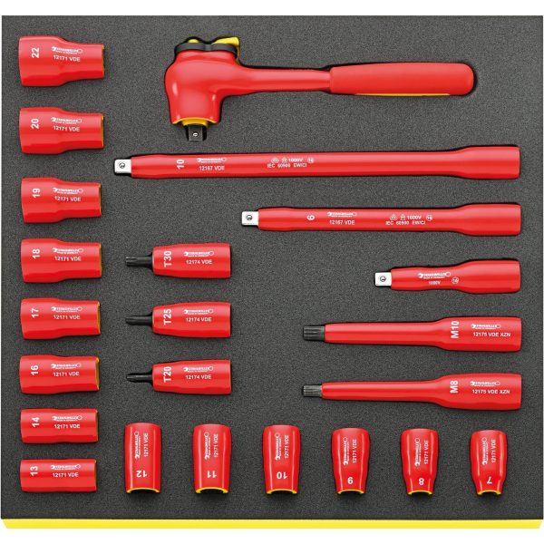 14 VDE-Steckschlüsseleinsätze mit Doppelsechskant 3/8″ Nr. 12171 VDE: 7; 8; 9; 10; 11; 12; 13; 14; 16; 17; 18; 19; 20; 22 mm