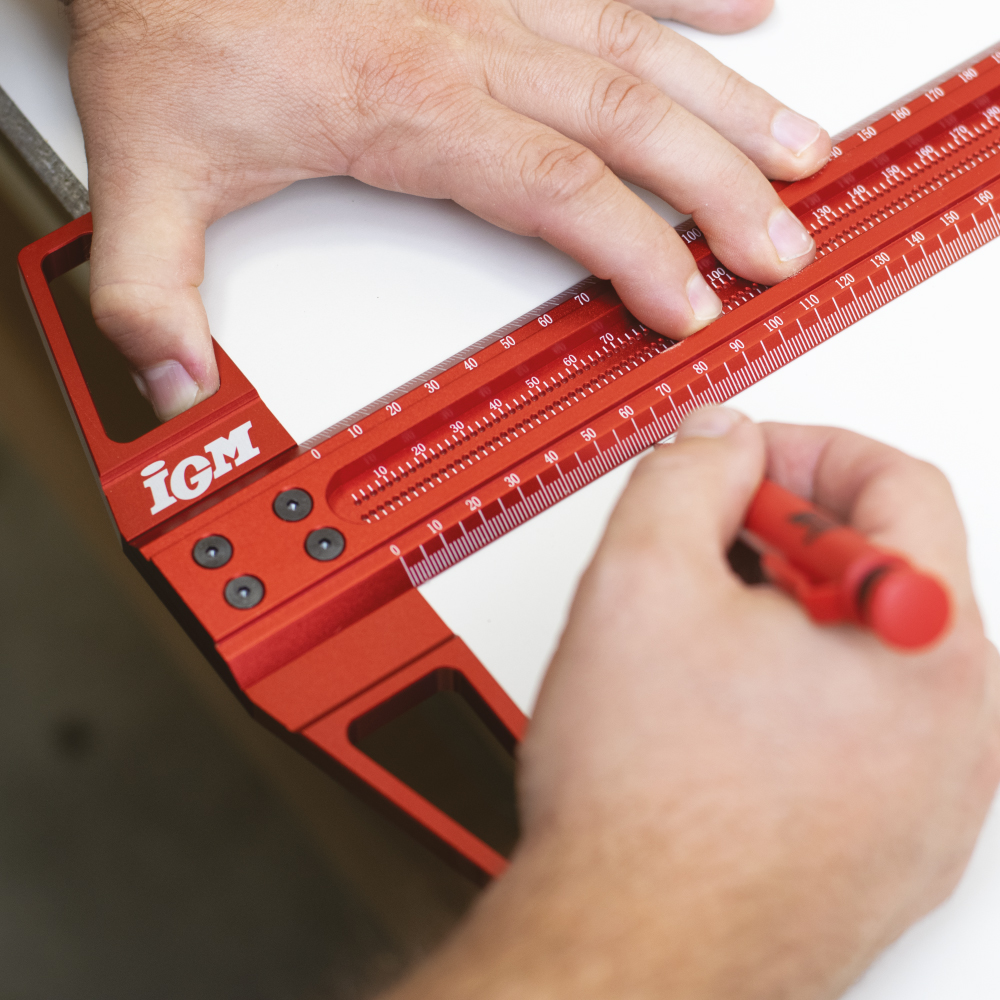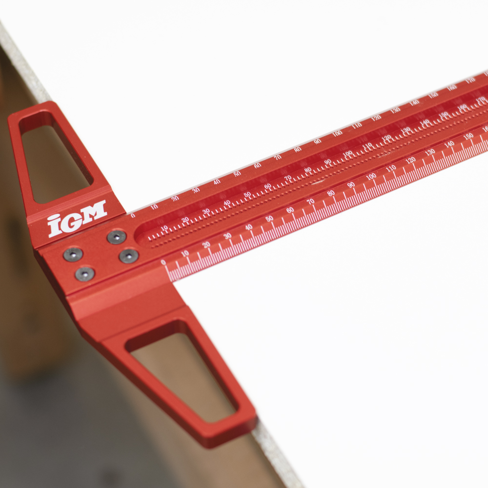 Präzise Markierung und Größenbestimmung, das ist die IGM Markierungslehre 600 mm aus eloxiertem Duraluminium. Die Skala ist mit einem 1 mm Laser markiert. Die Kanten der Skala sind zur Arbeitsfläche hin abgeschrägt, um ein genaueres Zeichnen zu ermöglichen. Die Markierungslehre besteht aus zwei Teilen, nämlich der Basis und das Lineal, die dank der CNC-Bearbeitung der Auflageflächen perfekt zusammenpassen. Sie sind durch 4 feste Schrauben verbunden. Markierungslehre kann auch als Lineal nach Entfernung des Sockels verwendet werden. In der Mitte des Lineals befinden sich Markierungslöcher in zwei Reihen zur parallelen Markierung um 1 mm. Stecken Sie einfach die Spitze des Bleistifts in das Loch und ziehen Sie eine perfekt gerade Linie entlang der Tafel.
