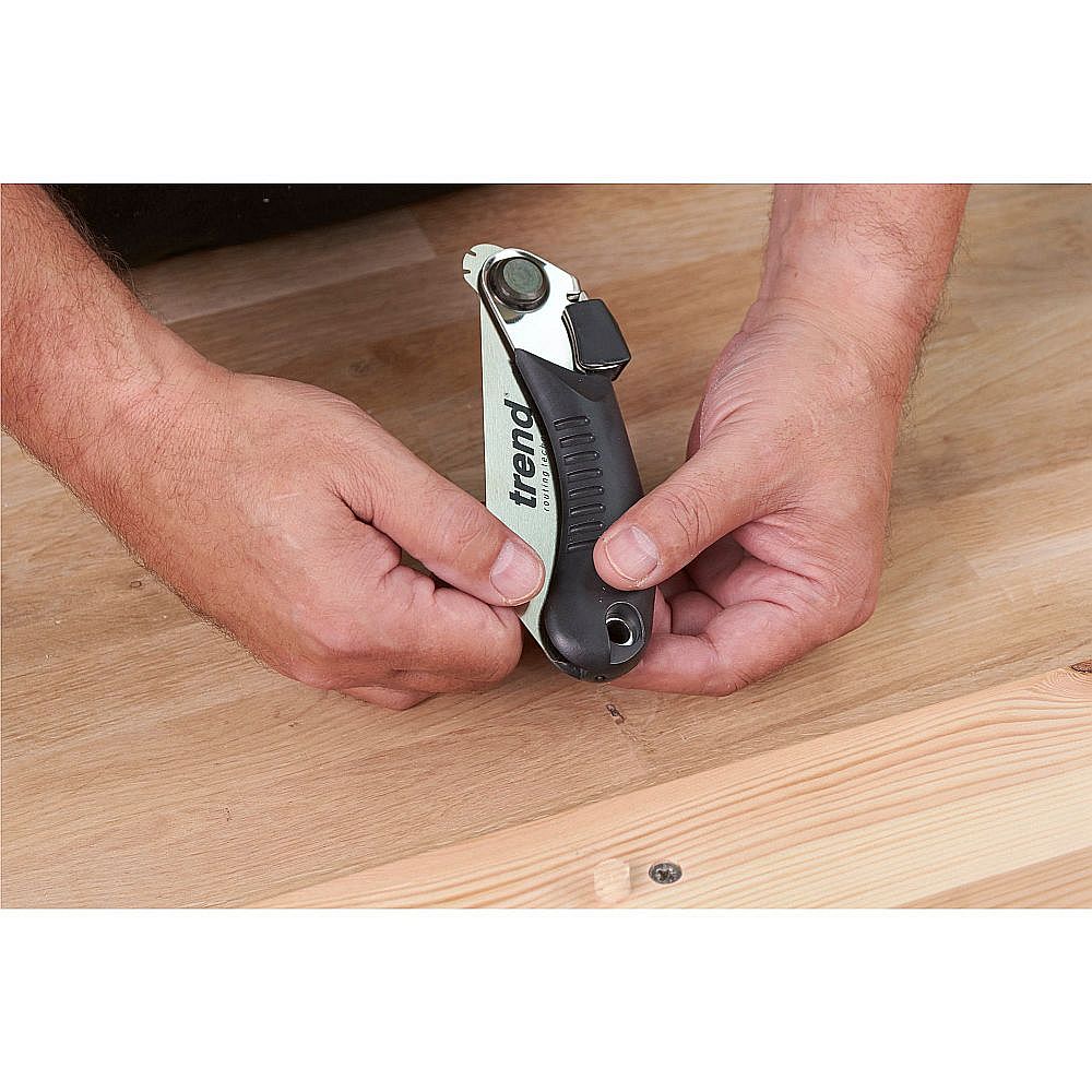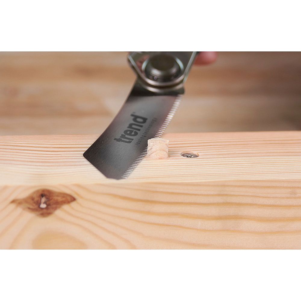 Trend Handklappsäge zum Schneiden von Dübeln und Holzstiften. So klein, dass man sie leicht in die Tasche stecken kann. Dank des flexiblen Sägeblatts und der spaltfreien Zähne können Sie direkt auf der Oberfläche des Materials schneiden, ohne es zu beschädigen. Zwei Arbeitspositionen des Sägeblattes. Das Sägeblatt hat eine gehärtete Schneidekante, was seine Lebensdauer verlängert. Gummierter Griff für komfortables Arbeiten. Sägeblattlänge 120 mm, 0,4 mm dünn. Extra fein 26 Zähne pro 30 mm (je 1,15 mm).
